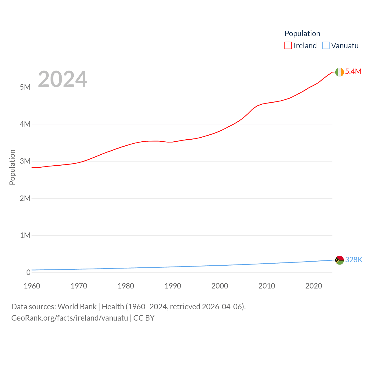 Ireland has a population of 5.4M (ranked 120/197), compared with 328K in Vanuatu (ranked 174/197). Ireland's land area is 26,599 sq mi versus 4,707 sq mi for Vanuatu (ranked 119th vs. 157th).