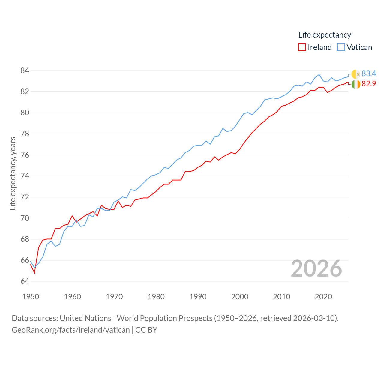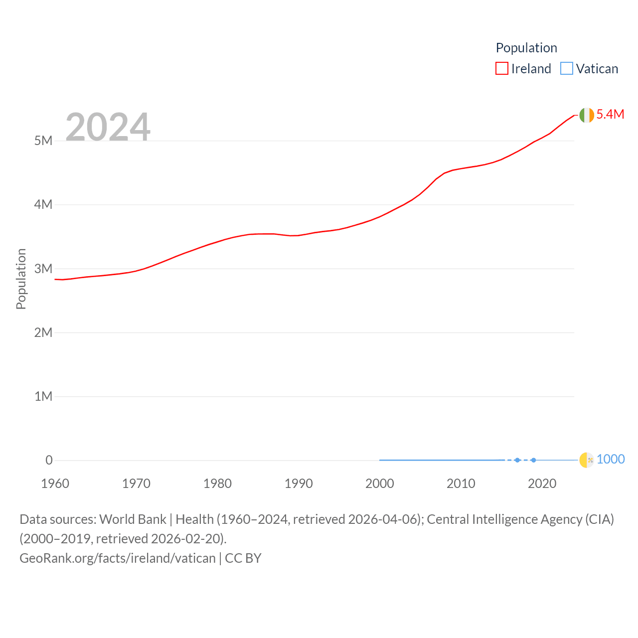 Ireland has a population of 5.4M (ranked 120/197), compared with 1K in The Vatican (ranked 197/197). Ireland's land area is 26,599 sq mi versus 0.17 sq mi for The Vatican (ranked 119th vs. 197th).