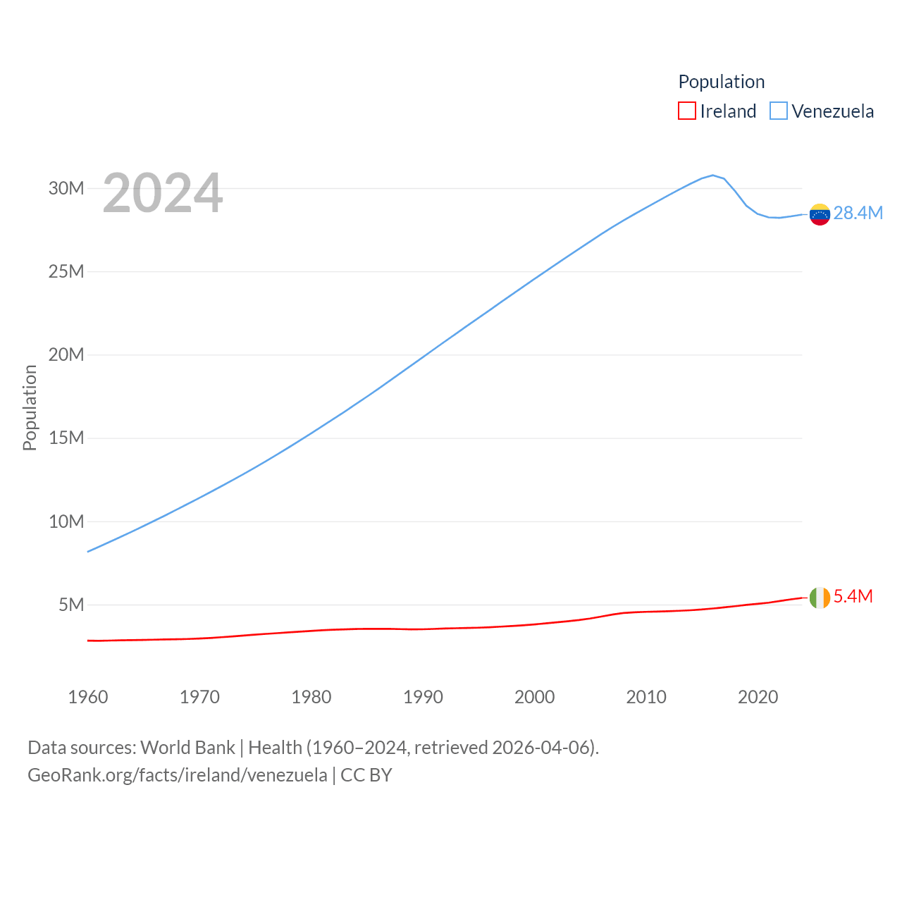 Ireland has a population of 5.4M (ranked 120/197), compared with 28.4M in Venezuela (ranked 53/197). Ireland's land area is 26,599 sq mi versus 340,561 sq mi for Venezuela (ranked 119th vs. 32nd).