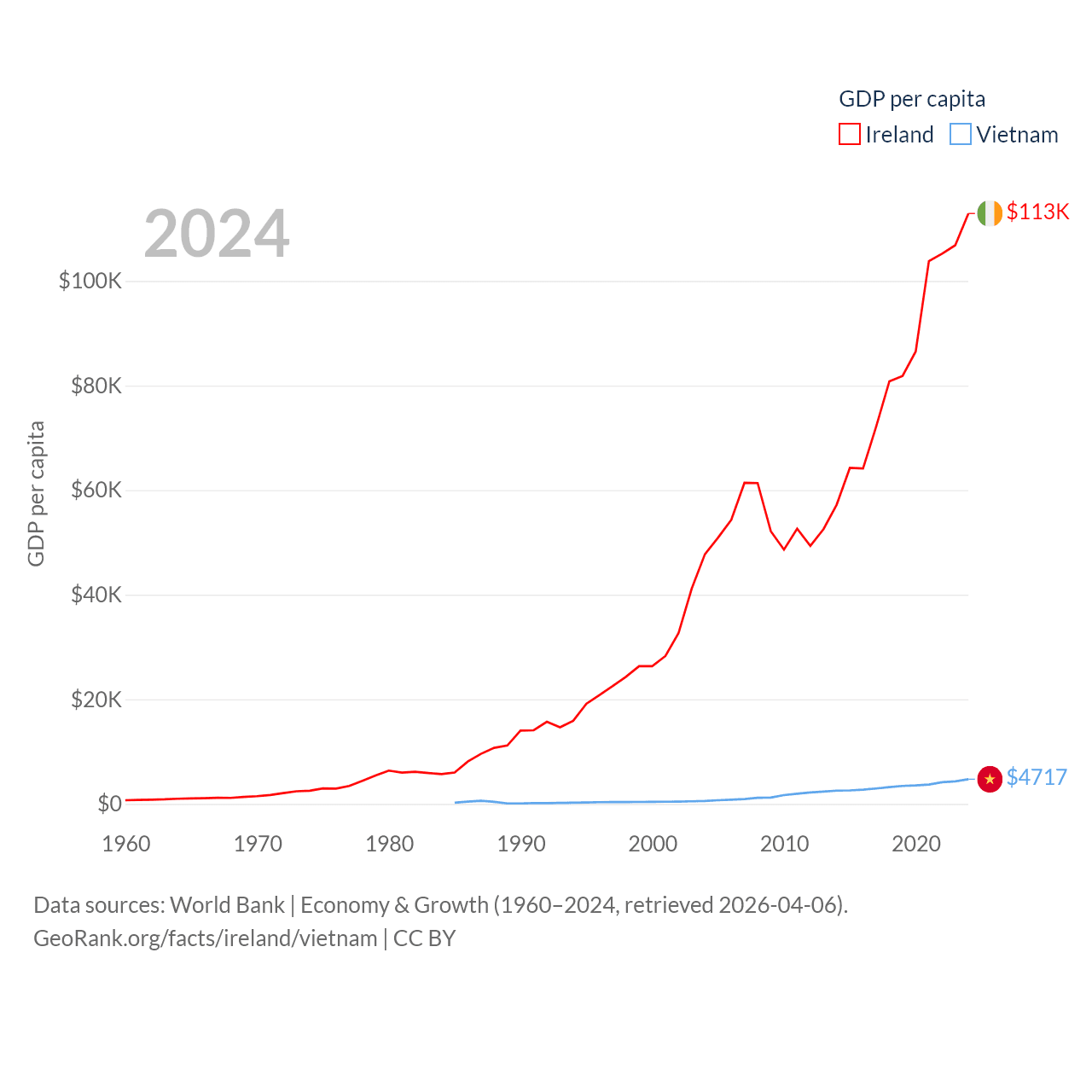 By GDP, Ireland ranks 25/197 ($609B) and Vietnam ranks 33/197 ($476B). By GDP per capita, Ireland ranks 4/197 ($112,895), while Vietnam ranks 122/197 ($4,717).