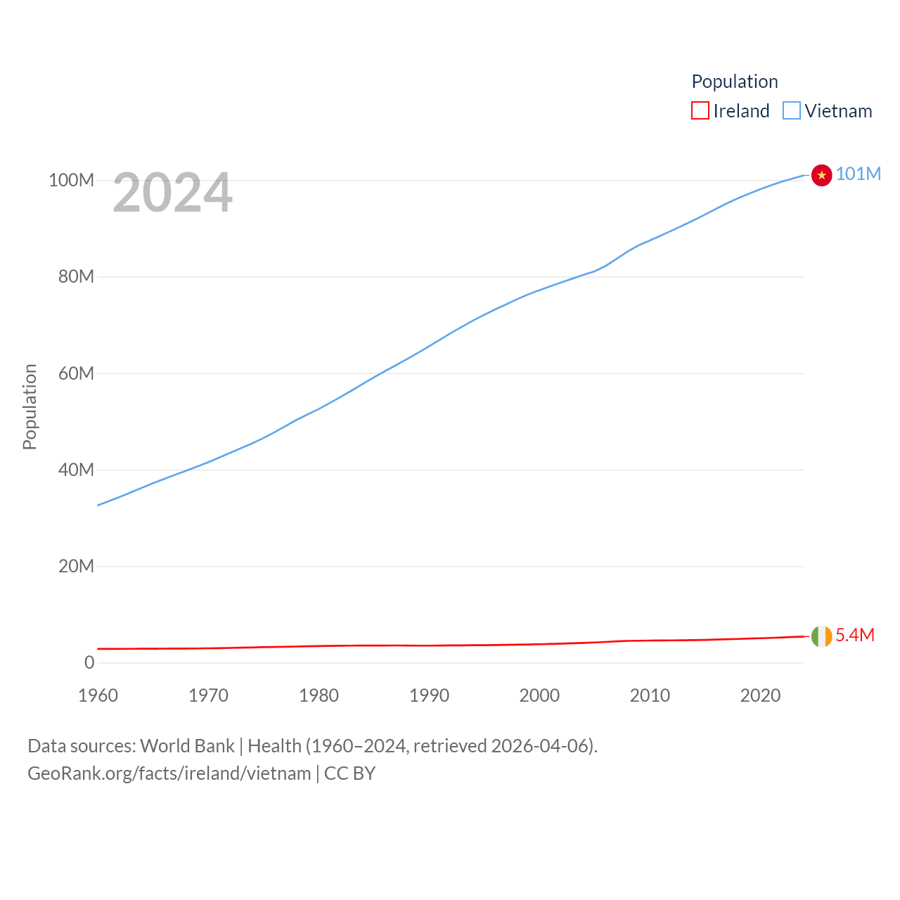 Ireland has a population of 5.4M (ranked 120/197), compared with 101M in Vietnam (ranked 16/197). Ireland's land area is 26,599 sq mi versus 121,016 sq mi for Vietnam (ranked 119th vs. 67th).