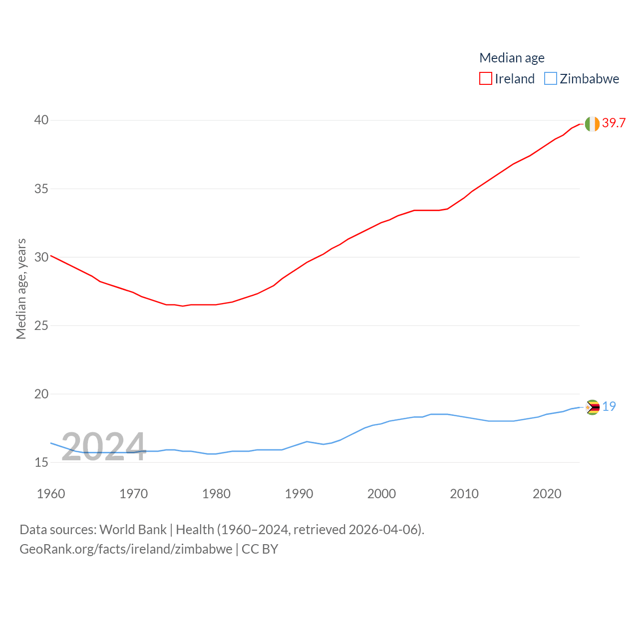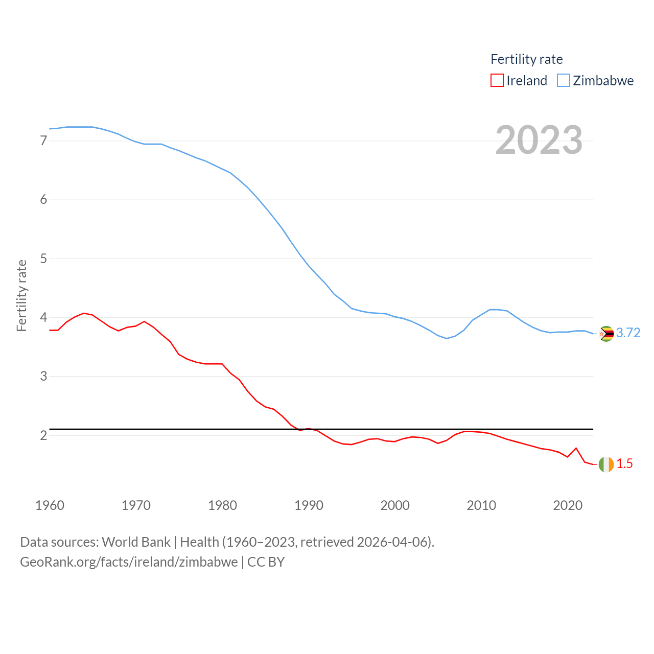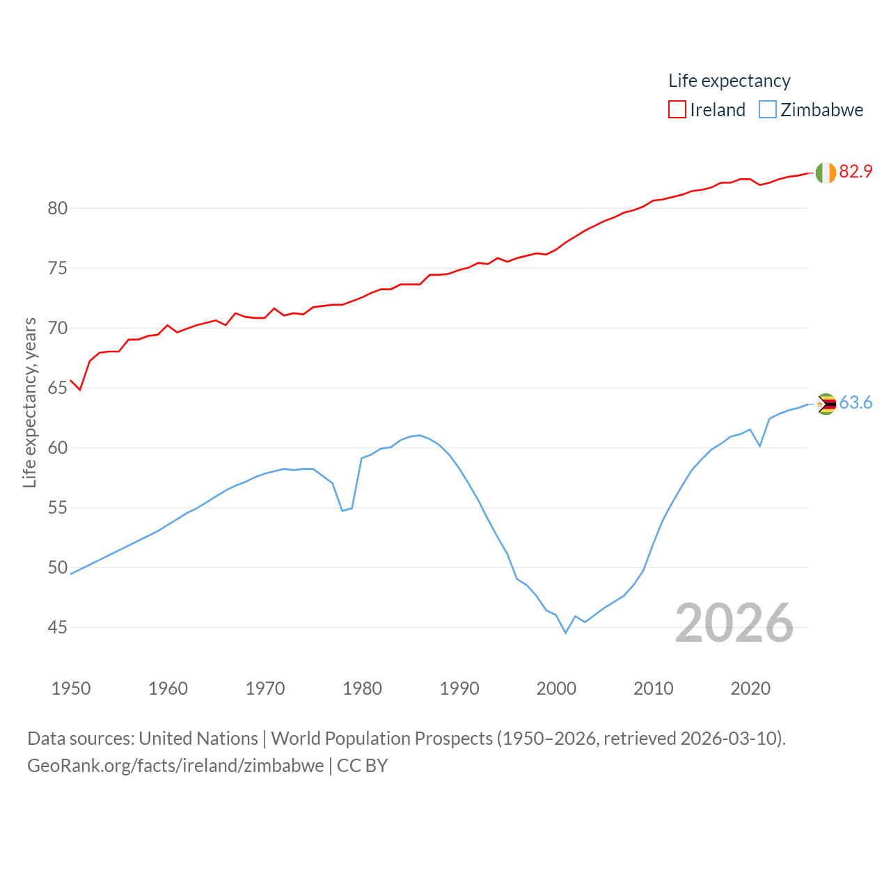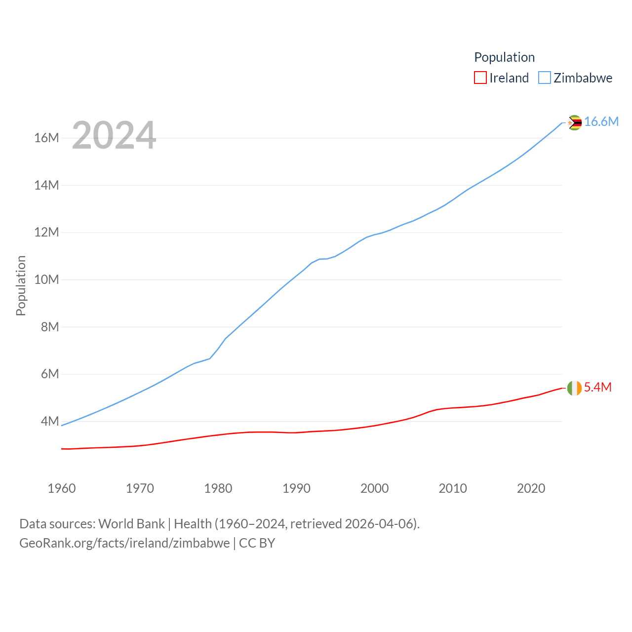 Ireland has a population of 5.4M (ranked 120/197), compared with 16.6M in Zimbabwe (ranked 74/197). Ireland's land area is 26,599 sq mi versus 149,364 sq mi for Zimbabwe (ranked 119th vs. 60th).