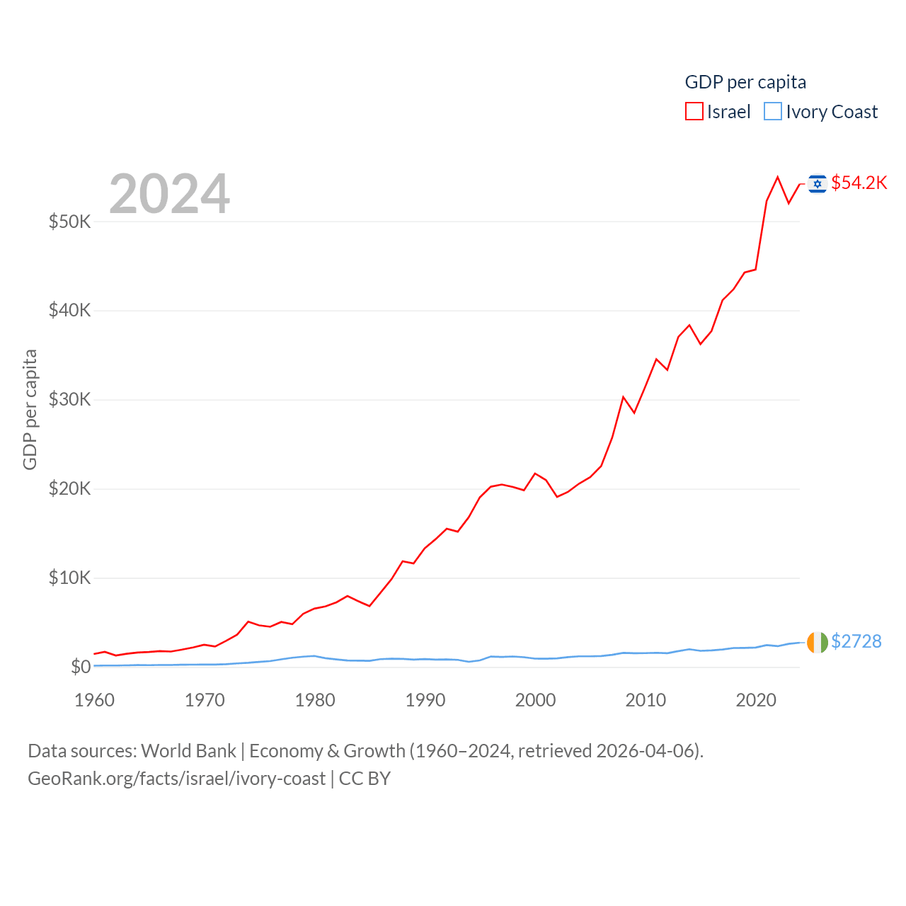 By GDP, Israel ranks 29/197 ($540B) and Ivory Coast ranks 77/197 ($87.1B). By GDP per capita, Israel ranks 21/197 ($54,177), while Ivory Coast ranks 142/197 ($2,728).