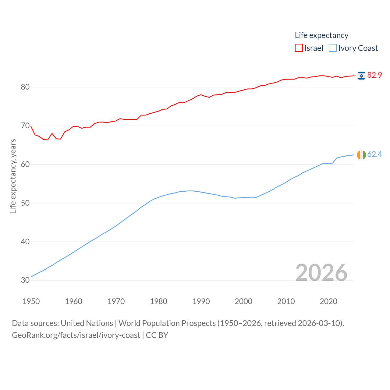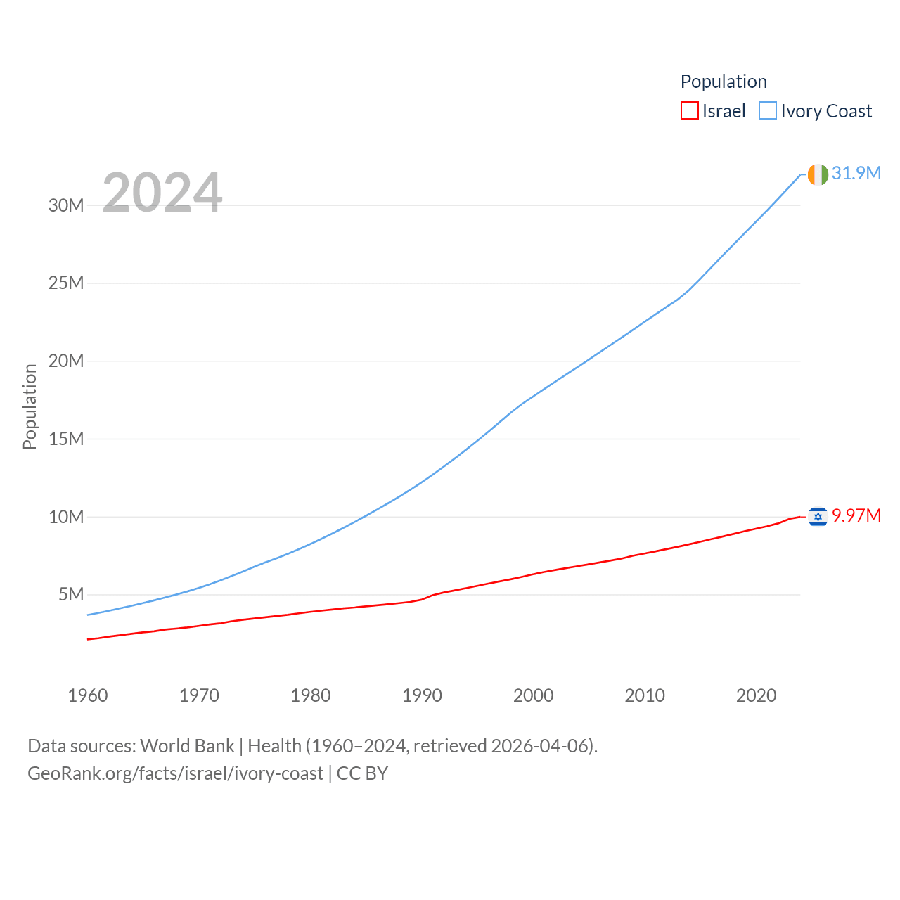 Israel has a population of 9.97M (ranked 96/197), compared with 31.9M in Ivory Coast (ranked 50/197). Israel's land area is 8,355 sq mi versus 122,780 sq mi for Ivory Coast (ranked 149th vs. 66th).
