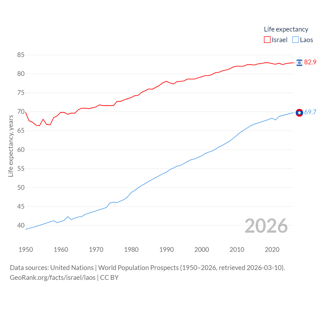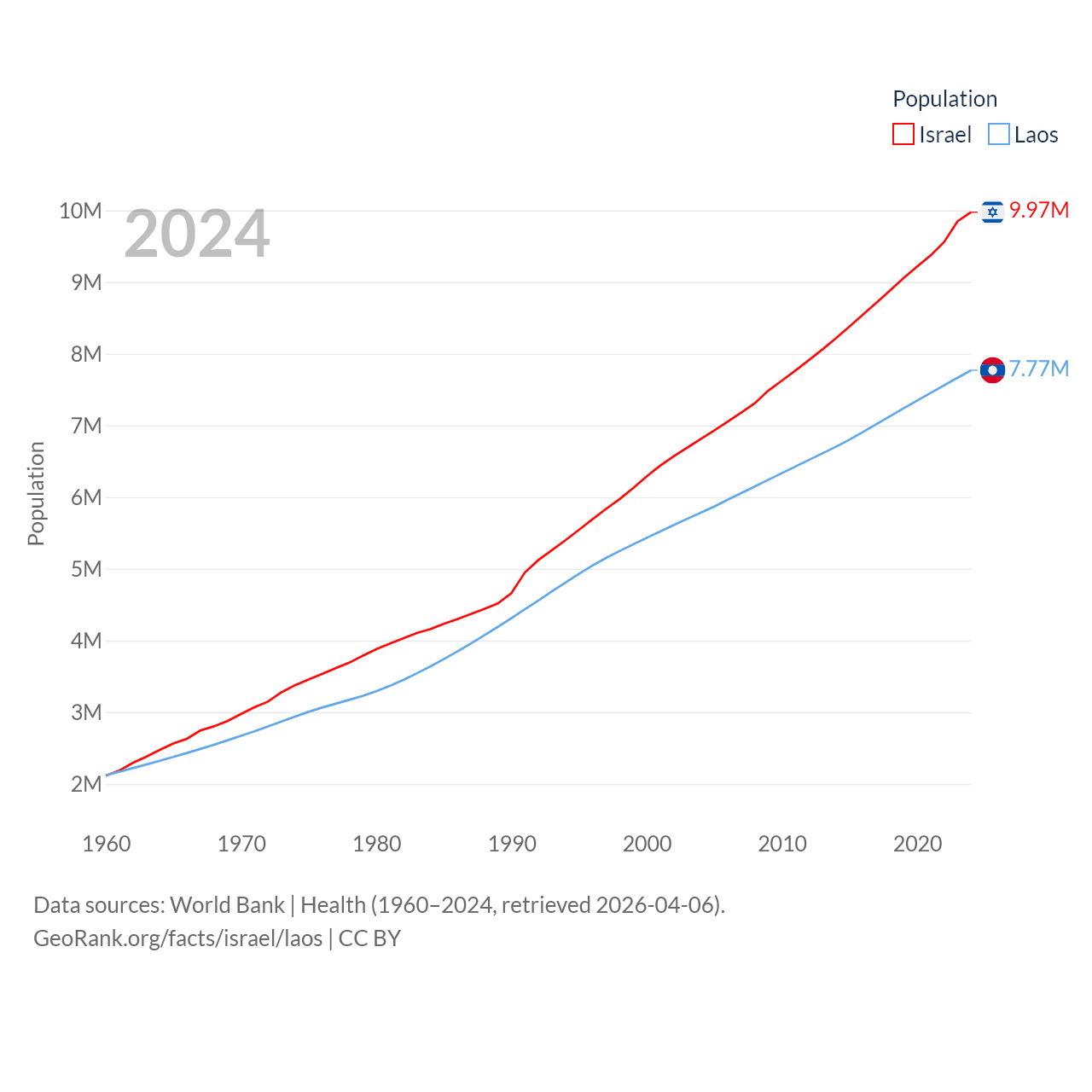 Israel has a population of 9.97M (ranked 96/197), compared with 7.77M in Laos (ranked 103/197). Israel's land area is 8,355 sq mi versus 89,112 sq mi for Laos (ranked 149th vs. 79th).