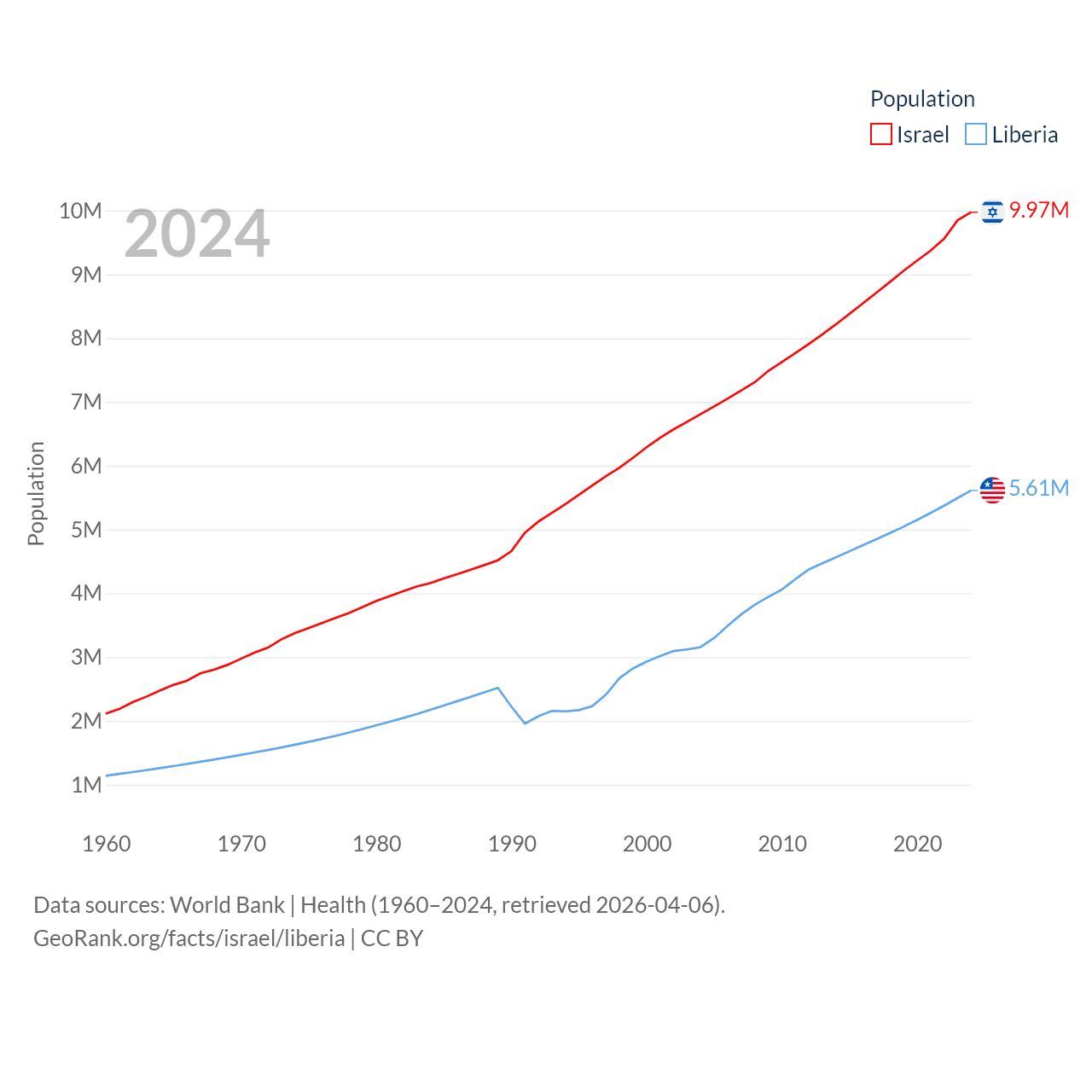 Israel has a population of 9.97M (ranked 96/197), compared with 5.61M in Liberia (ranked 117/197). Israel's land area is 8,355 sq mi versus 37,189 sq mi for Liberia (ranked 149th vs. 106th).