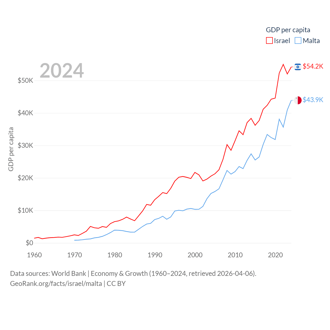 By GDP, Israel ranks 29/197 ($540B) and Malta ranks 119/197 ($25B). By GDP per capita, Israel ranks 21/197 ($54,177), while Malta ranks 28/197 ($43,899).