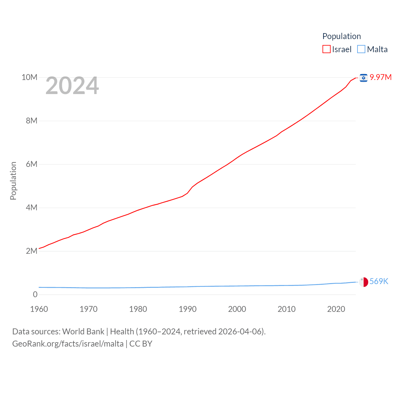 Israel has a population of 9.97M (ranked 96/197), compared with 569K in Malta (ranked 167/197). Israel's land area is 8,355 sq mi versus 123.6 sq mi for Malta (ranked 149th vs. 187th).