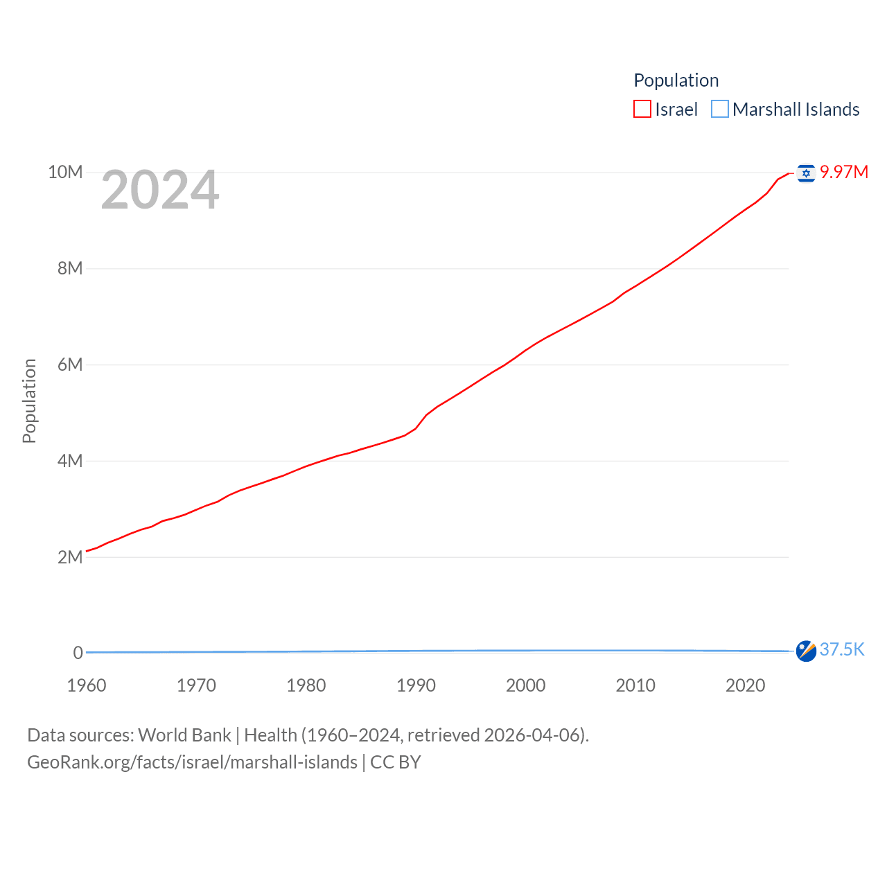 Israel has a population of 9.97M (ranked 96/197), compared with 37.5K in The Marshall Islands (ranked 192/197). Israel's land area is 8,355 sq mi versus 69.5 sq mi for The Marshall Islands (ranked 149th vs. 191st).
