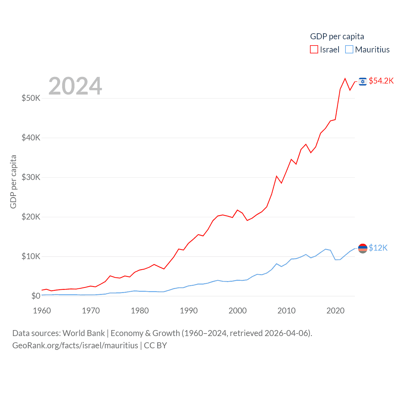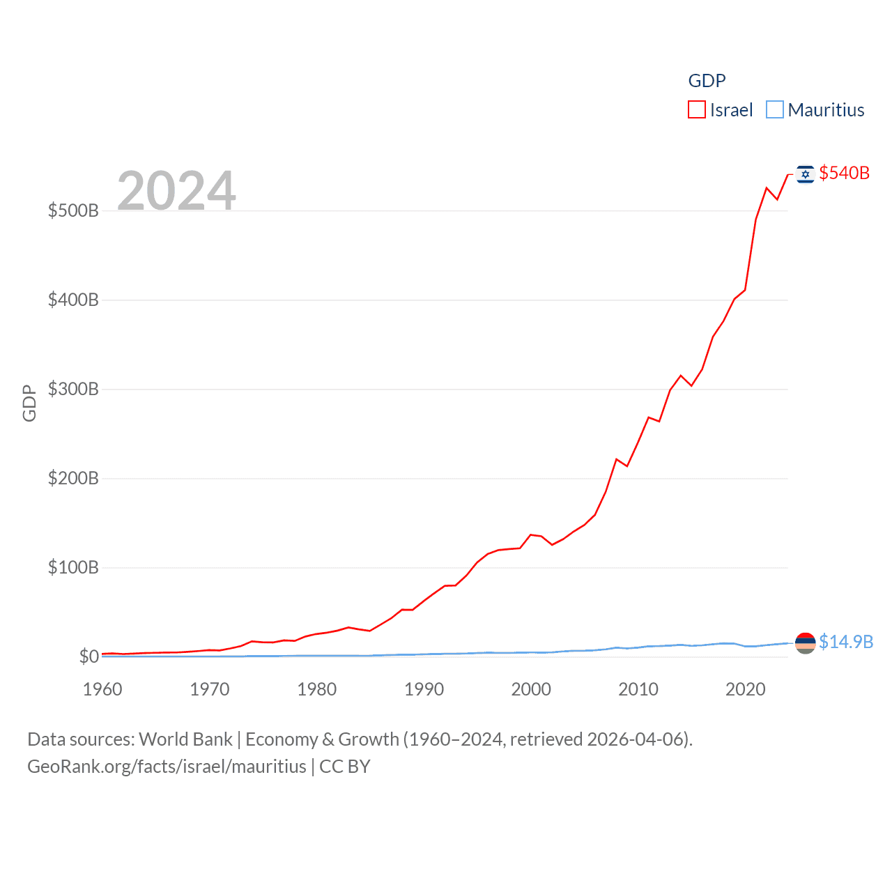 By GDP, Israel ranks 29/197 ($540B) and Mauritius ranks 143/197 ($14.9B). By GDP per capita, Israel ranks 21/197 ($54,177), while Mauritius ranks 78/197 ($11,991).