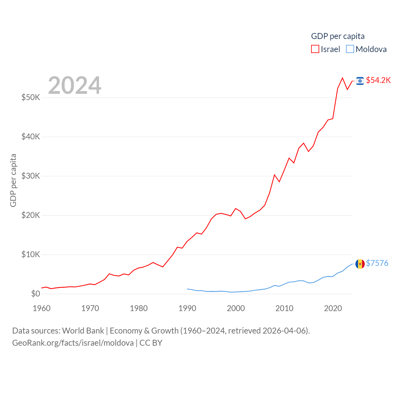 By GDP, Israel ranks 29/197 ($540B) and Moldova ranks 134/197 ($18.2B). By GDP per capita, Israel ranks 21/197 ($54,177), while Moldova ranks 99/197 ($7,576).