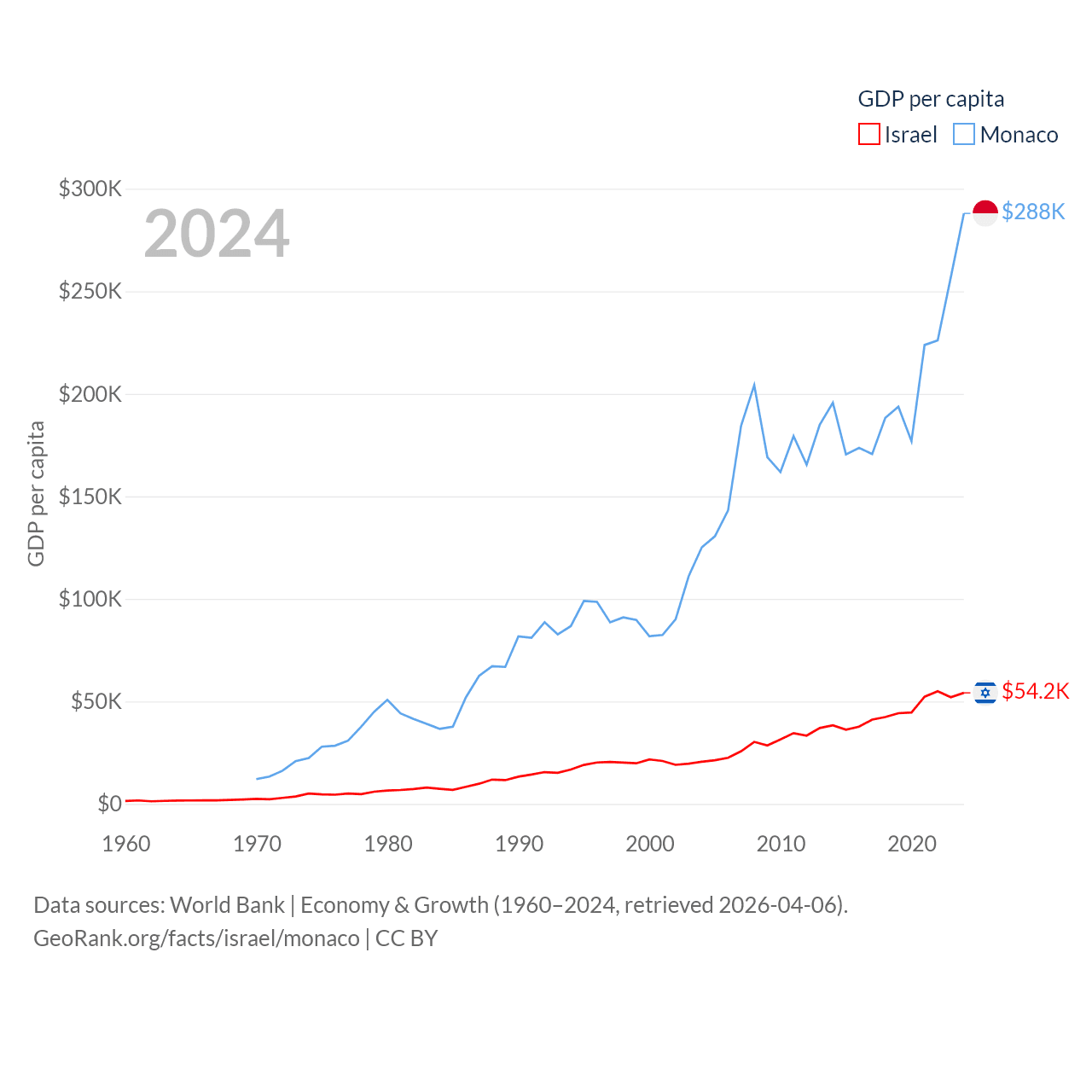 By GDP, Israel ranks 29/197 ($540B) and Monaco ranks 152/197 ($11.1B). By GDP per capita, Israel ranks 21/197 ($54,177), while Monaco ranks 1/197 ($288,001).