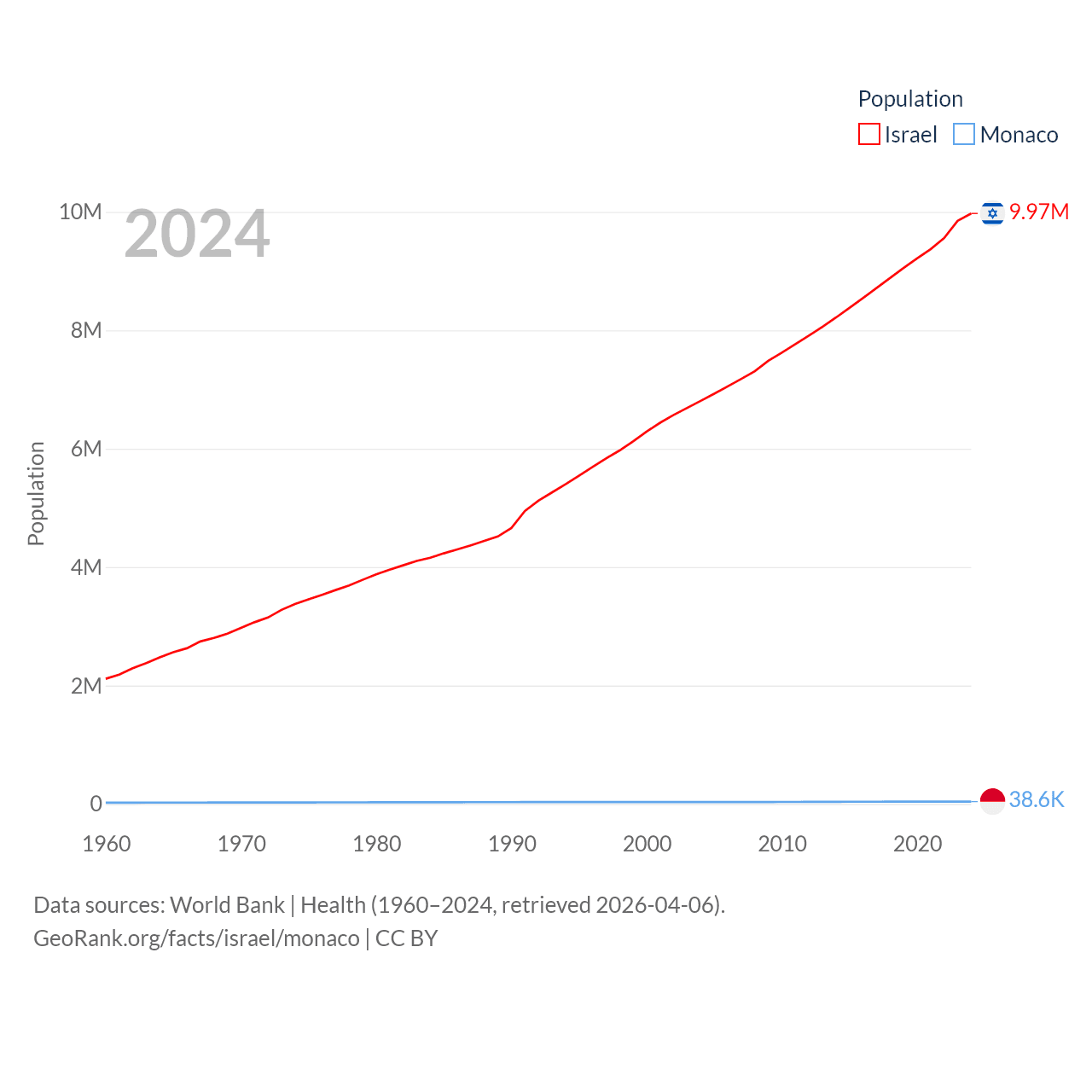 Israel has a population of 9.97M (ranked 96/197), compared with 38.6K in Monaco (ranked 191/197). Israel's land area is 8,355 sq mi versus 0.8 sq mi for Monaco (ranked 149th vs. 196th).
