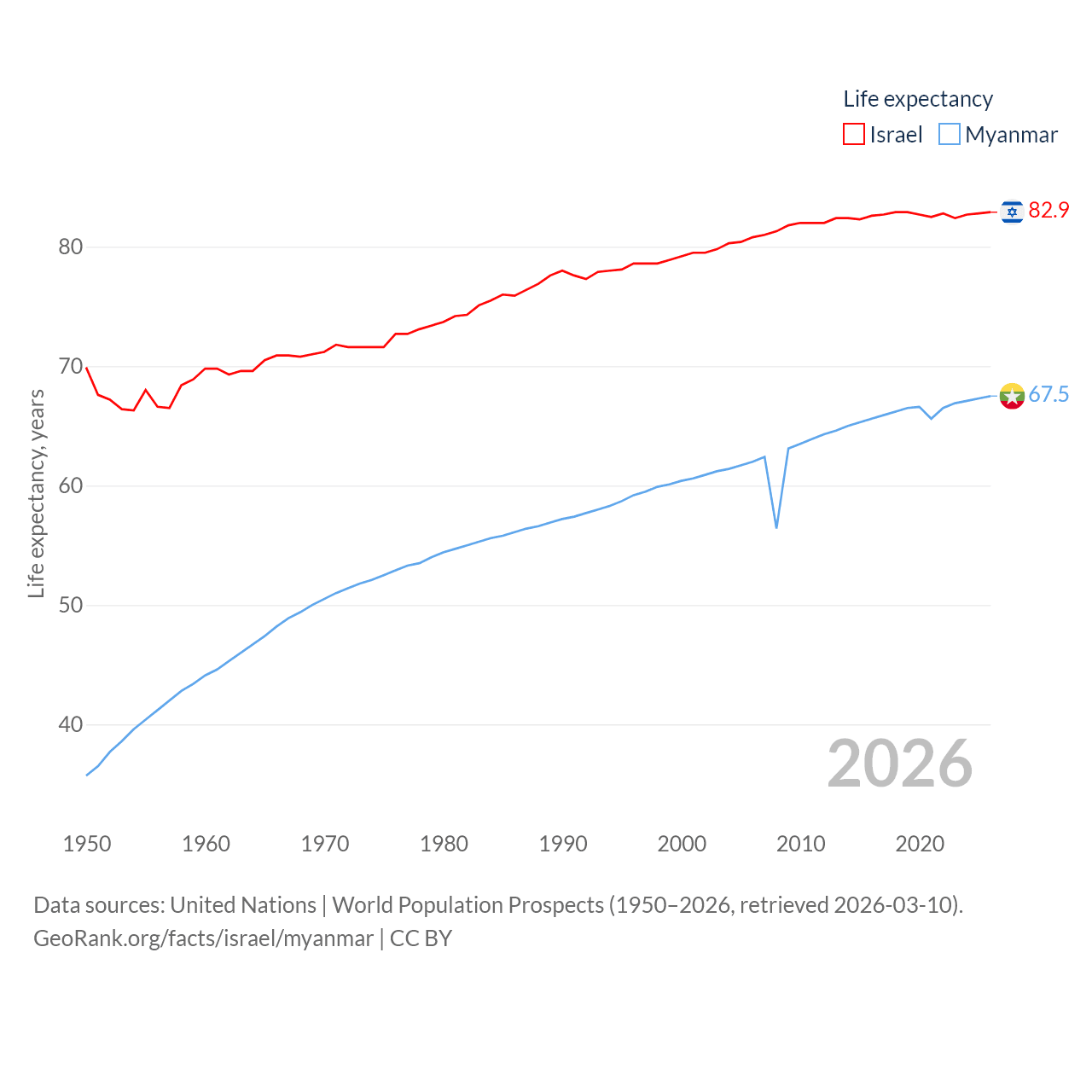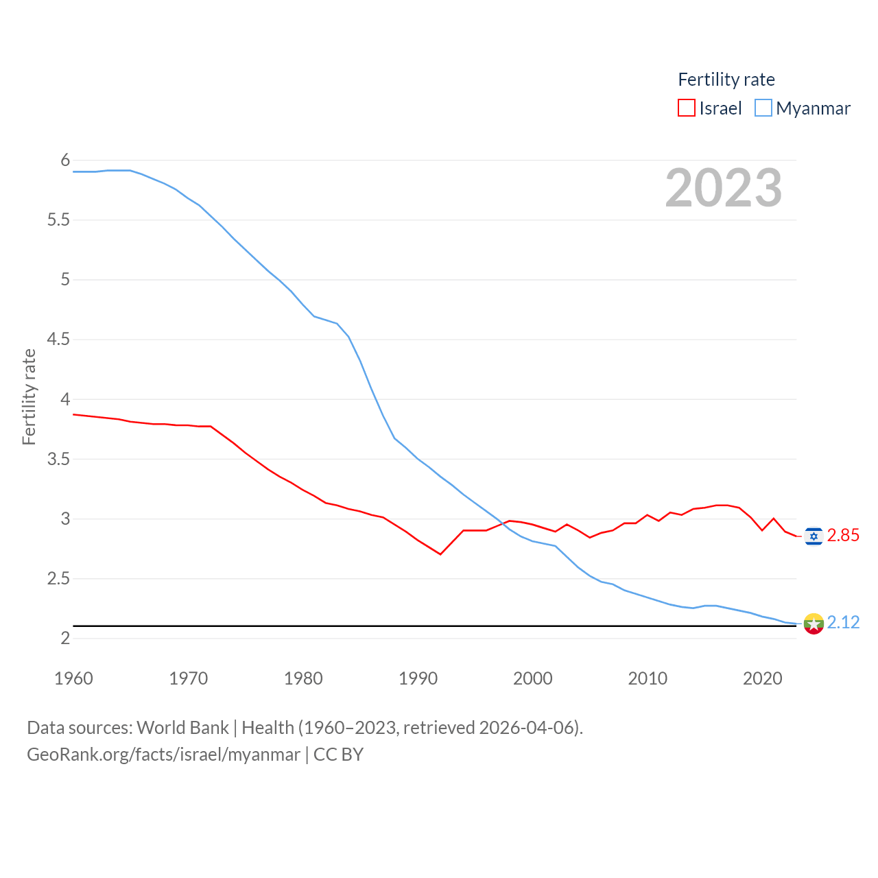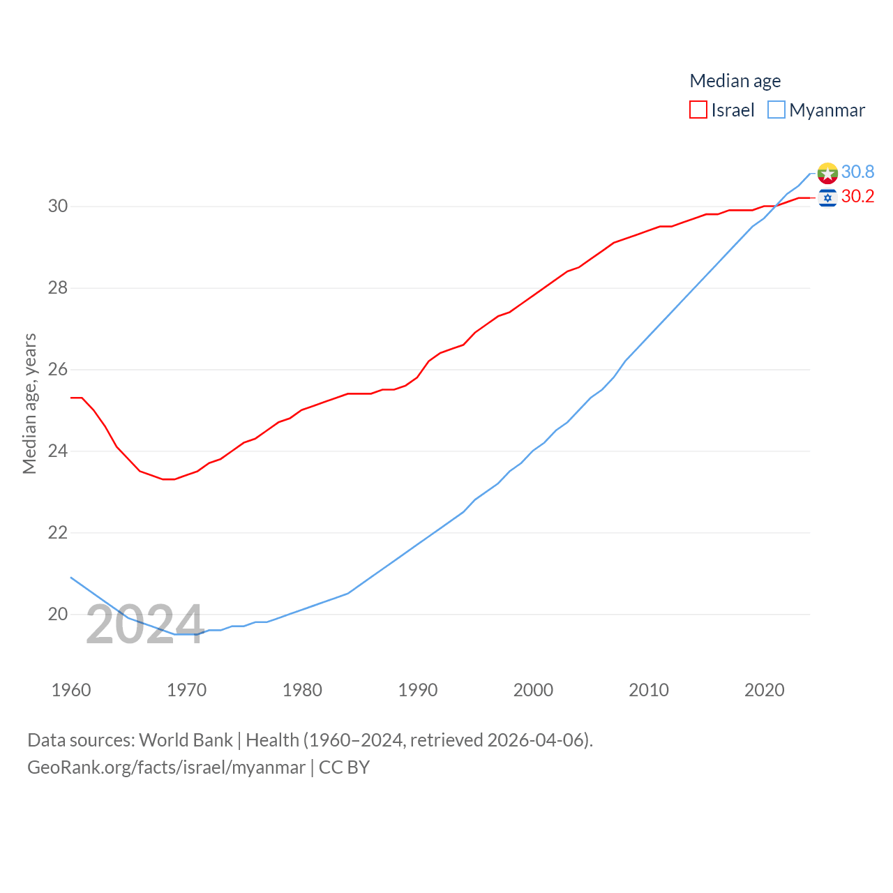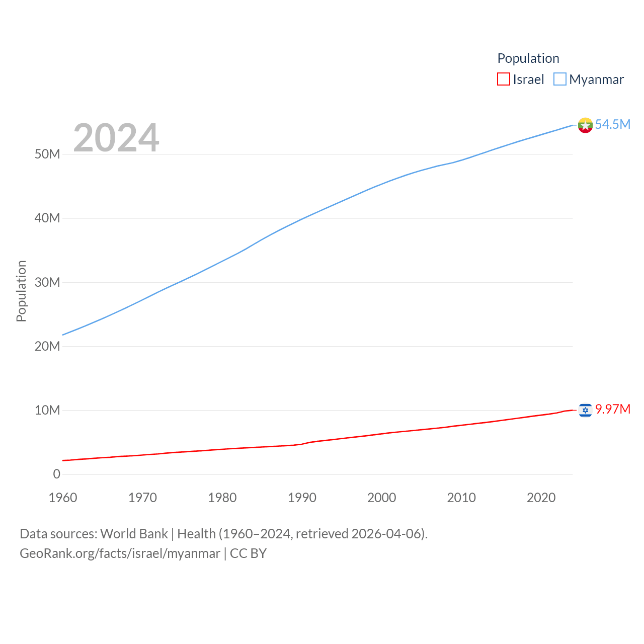 Israel has a population of 9.97M (ranked 96/197), compared with 54.5M in Myanmar (ranked 27/197). Israel's land area is 8,355 sq mi versus 251,997 sq mi for Myanmar (ranked 149th vs. 39th).
