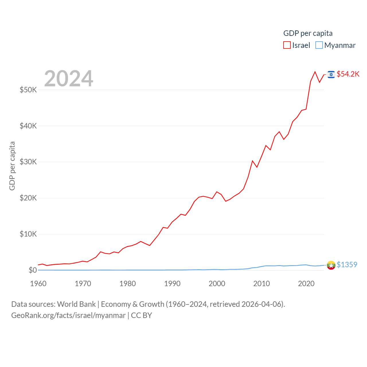 By GDP, Israel ranks 29/197 ($540B) and Myanmar ranks 85/197 ($74.1B). By GDP per capita, Israel ranks 21/197 ($54,177), while Myanmar ranks 165/197 ($1,359).