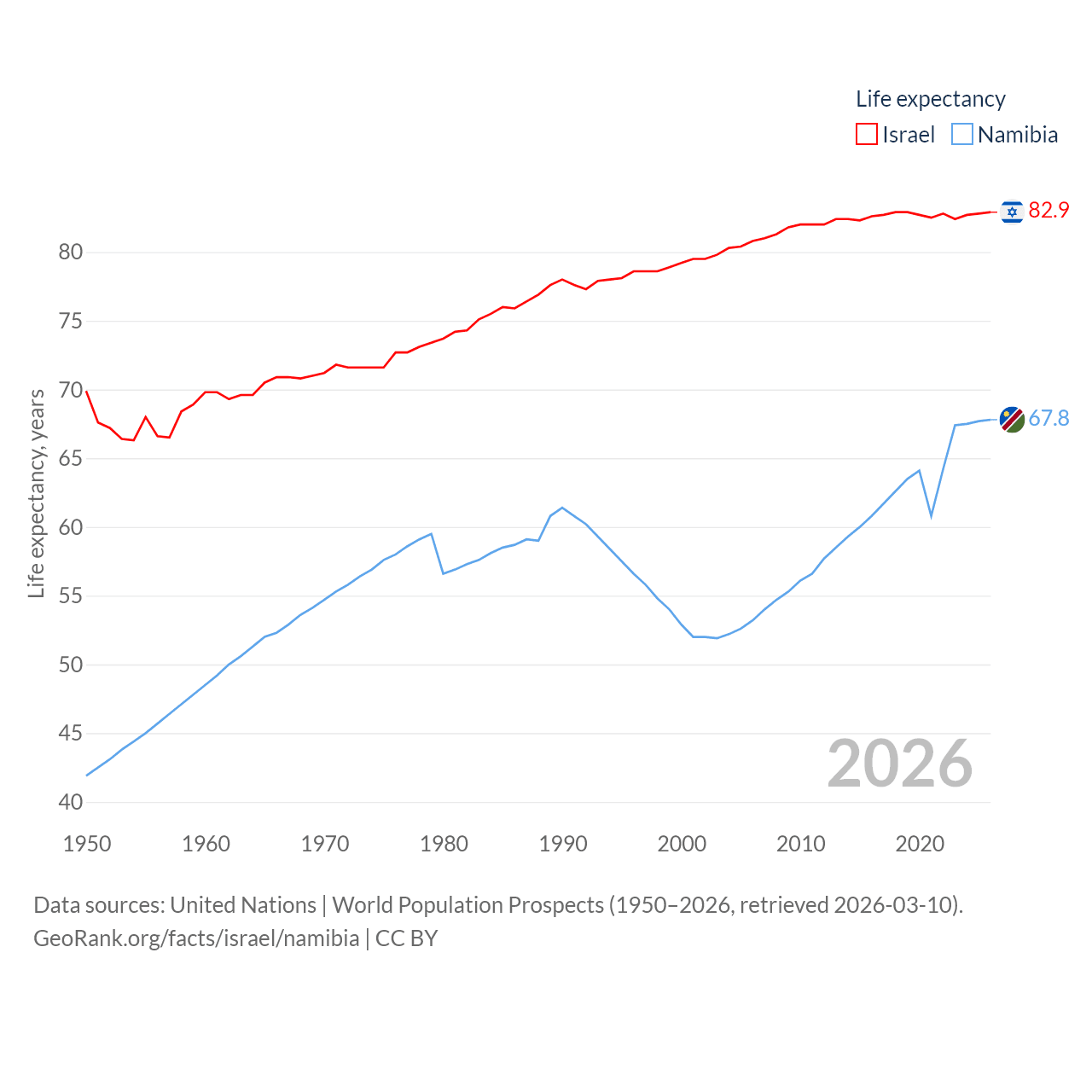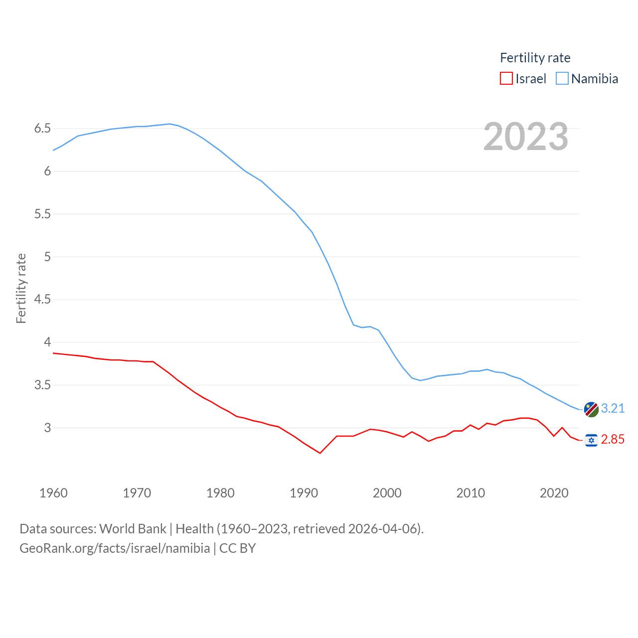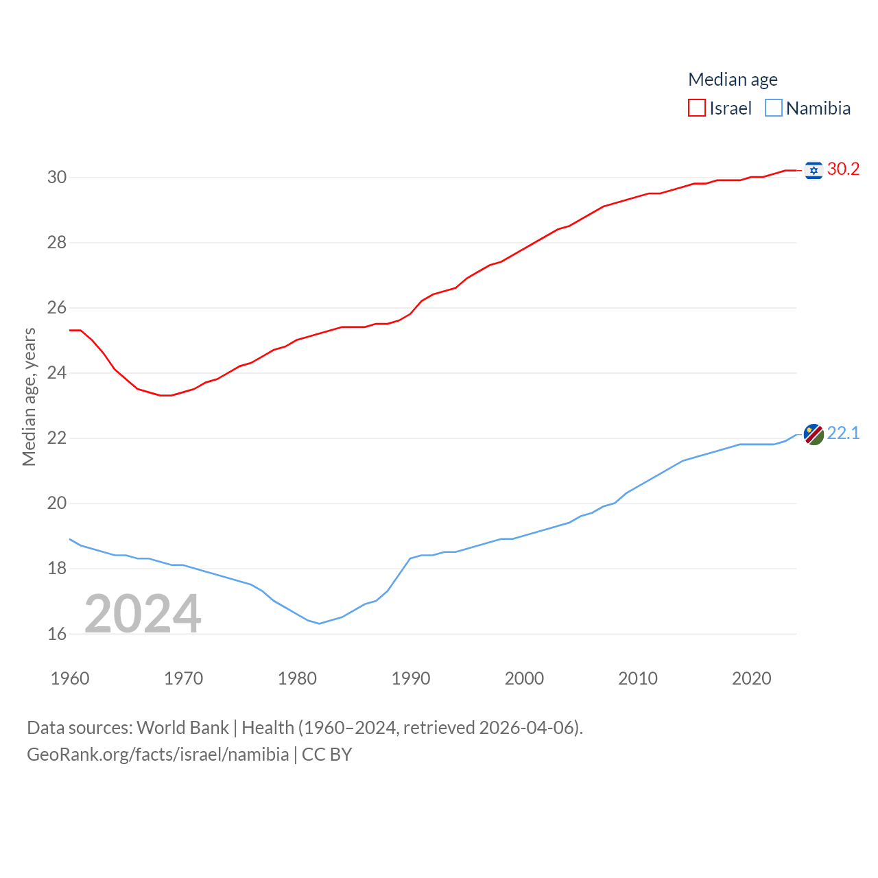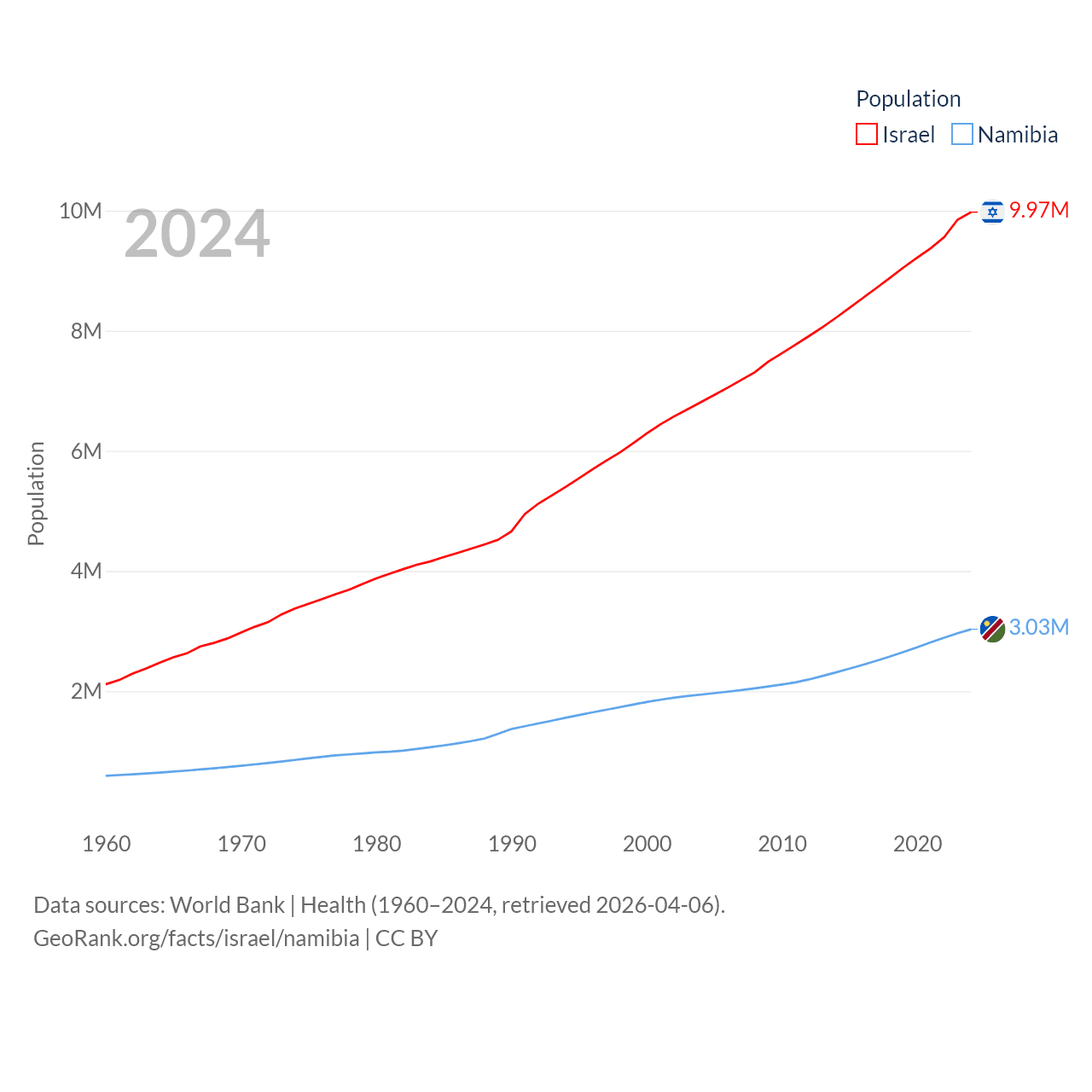 Israel has a population of 9.97M (ranked 96/197), compared with 3.03M in Namibia (ranked 136/197). Israel's land area is 8,355 sq mi versus 317,874 sq mi for Namibia (ranked 149th vs. 33rd).