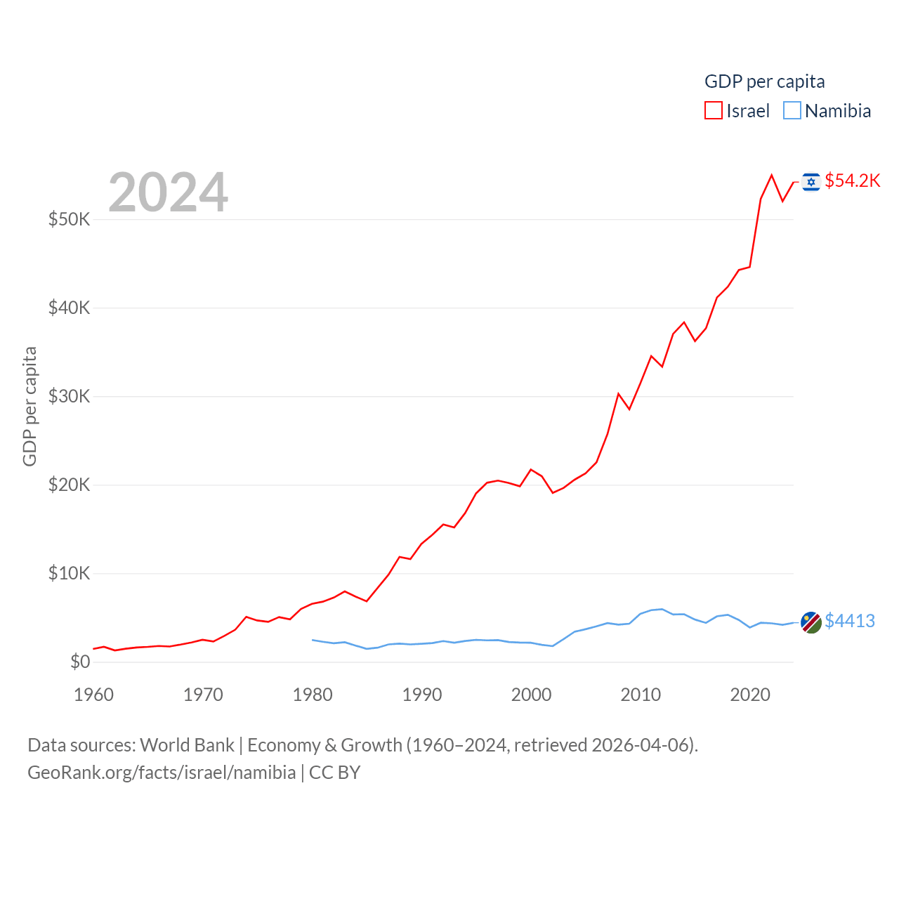 By GDP, Israel ranks 29/197 ($540B) and Namibia ranks 147/197 ($13.4B). By GDP per capita, Israel ranks 21/197 ($54,177), while Namibia ranks 126/197 ($4,413).