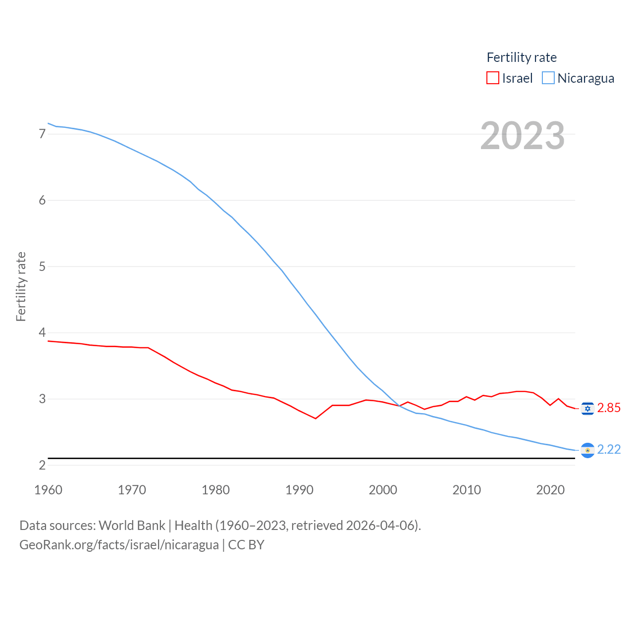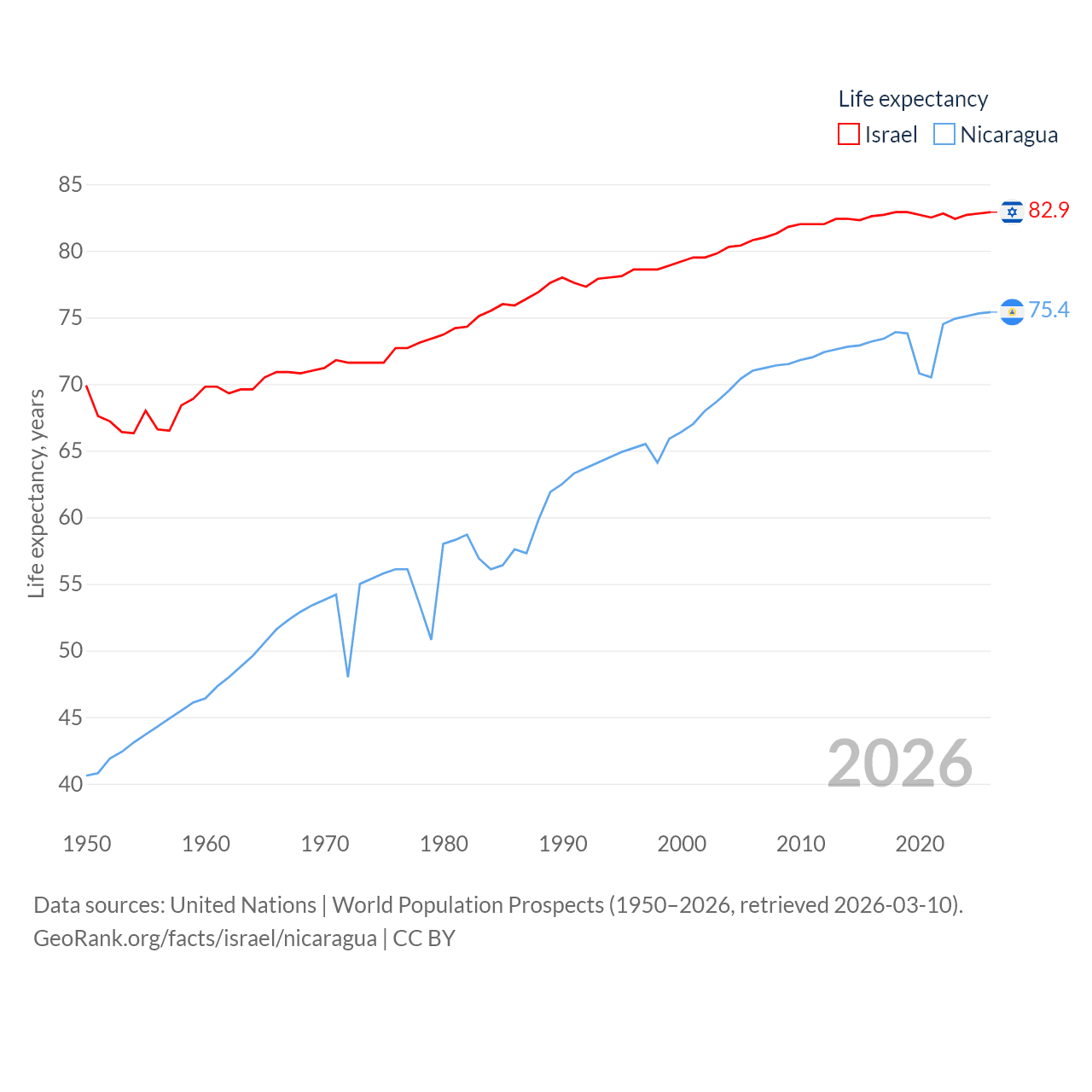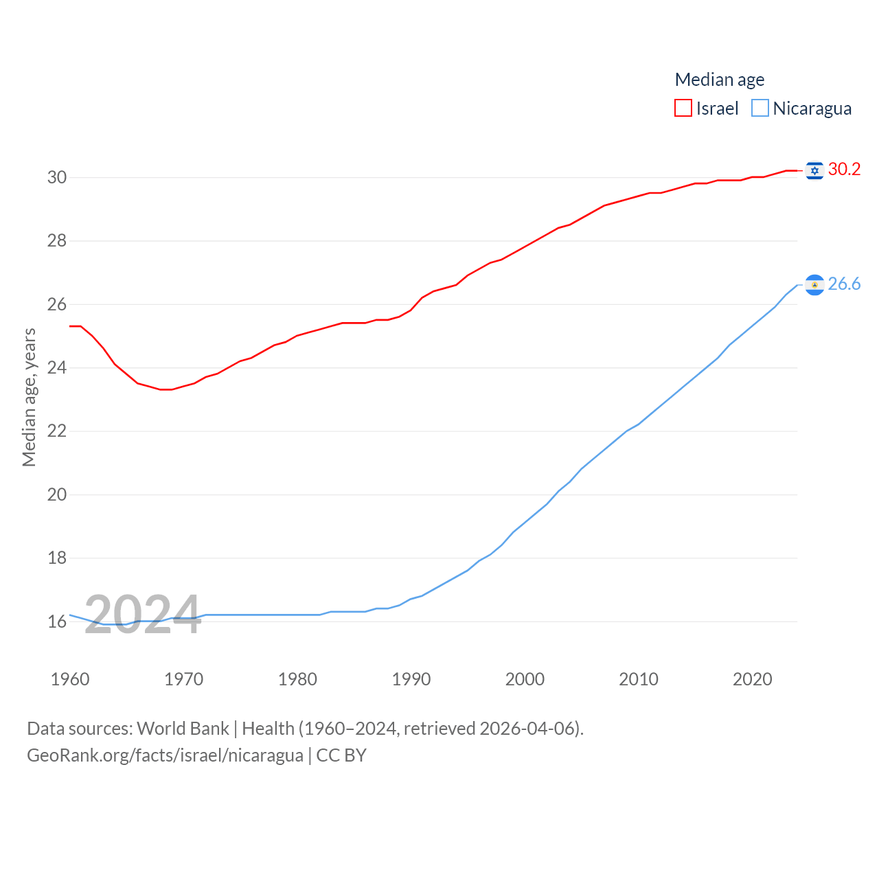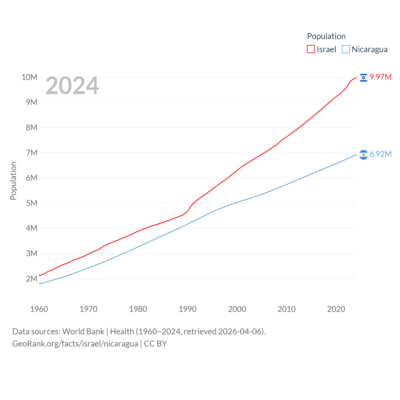 Israel has a population of 9.97M (ranked 96/197), compared with 6.92M in Nicaragua (ranked 108/197). Israel's land area is 8,355 sq mi versus 46,464 sq mi for Nicaragua (ranked 149th vs. 98th).