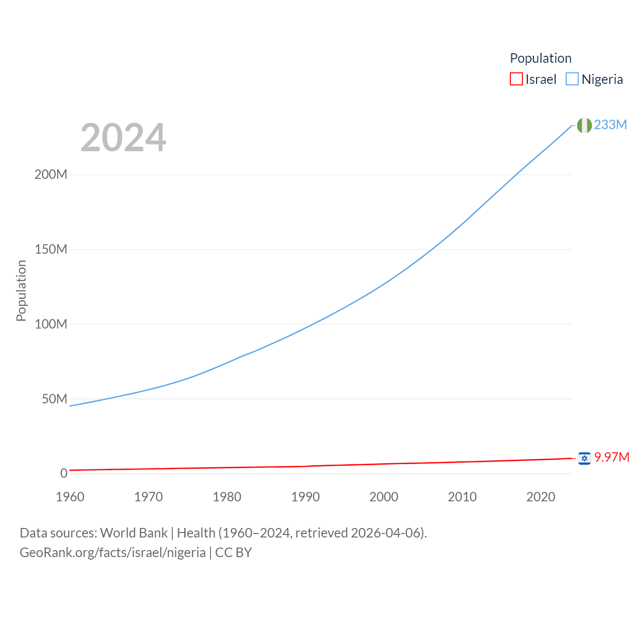 Israel has a population of 9.97M (ranked 96/197), compared with 233M in Nigeria (ranked 6/197). Israel's land area is 8,355 sq mi versus 351,650 sq mi for Nigeria (ranked 149th vs. 30th).