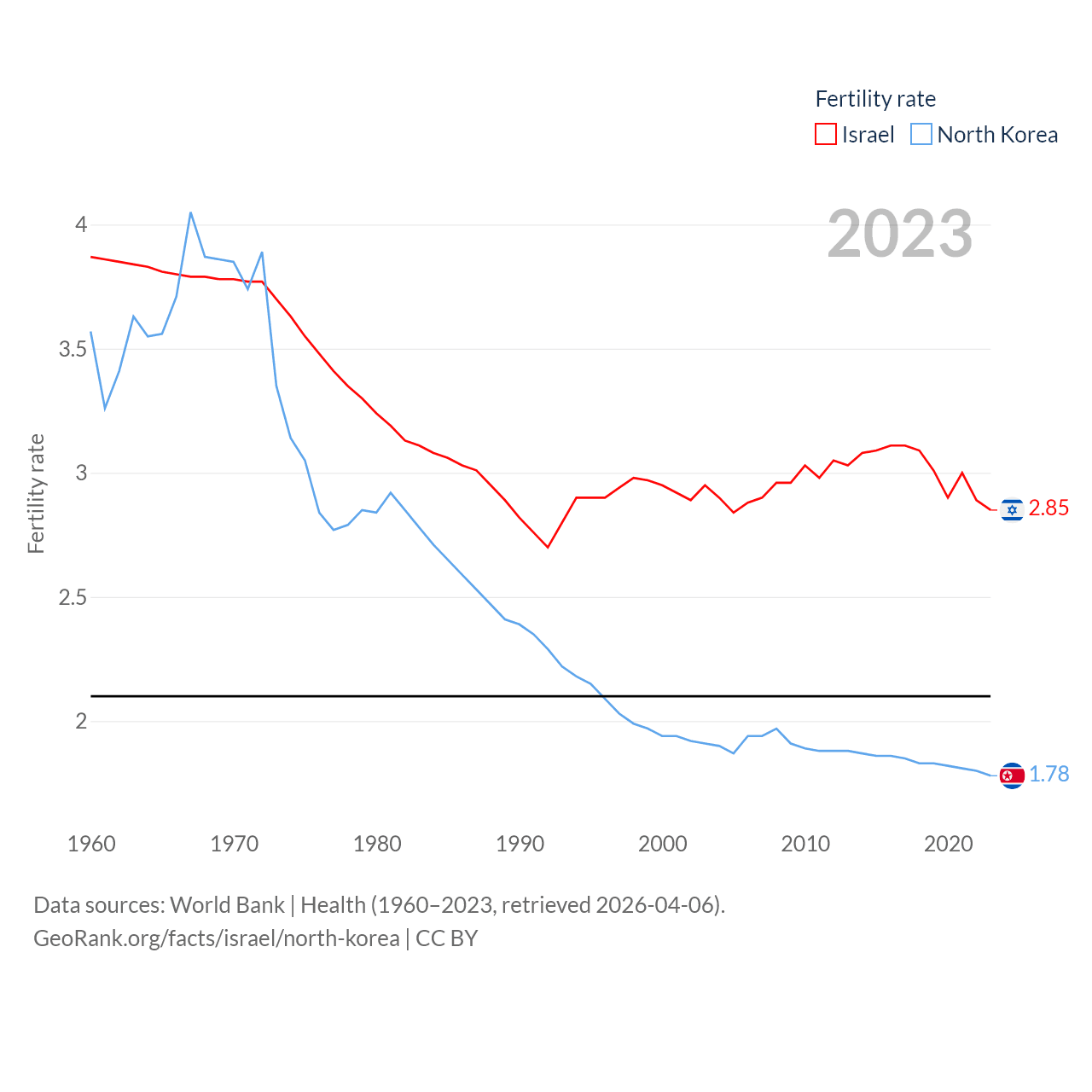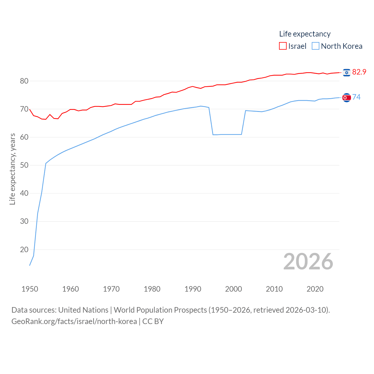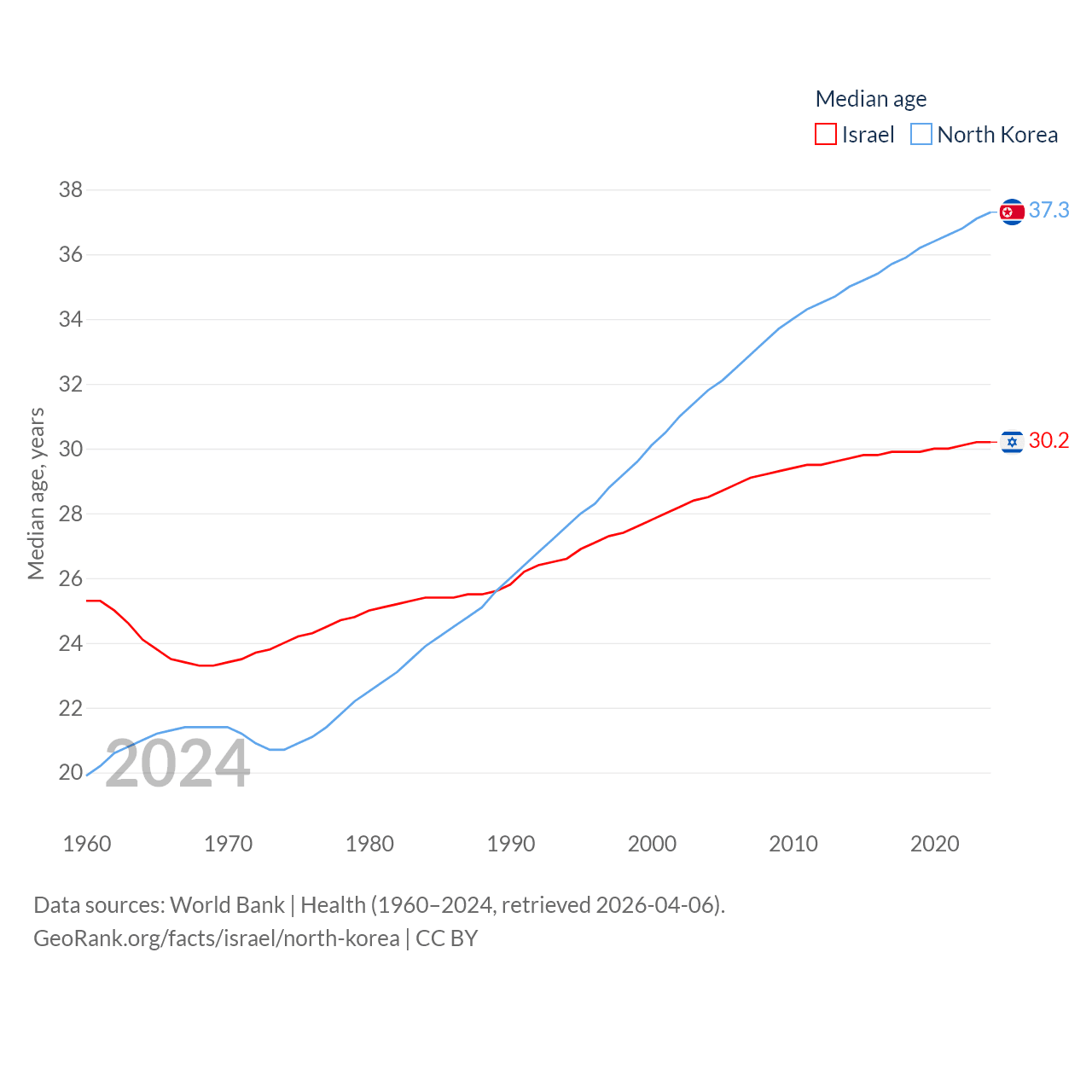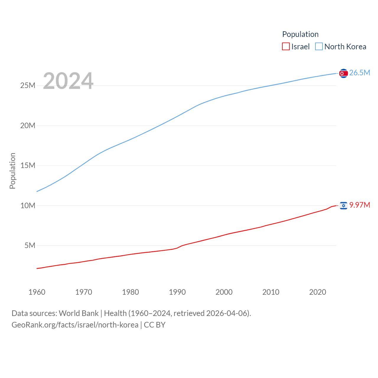 Israel has a population of 9.97M (ranked 96/197), compared with 26.5M in North Korea (ranked 56/197). Israel's land area is 8,355 sq mi versus 46,491 sq mi for North Korea (ranked 149th vs. 97th).