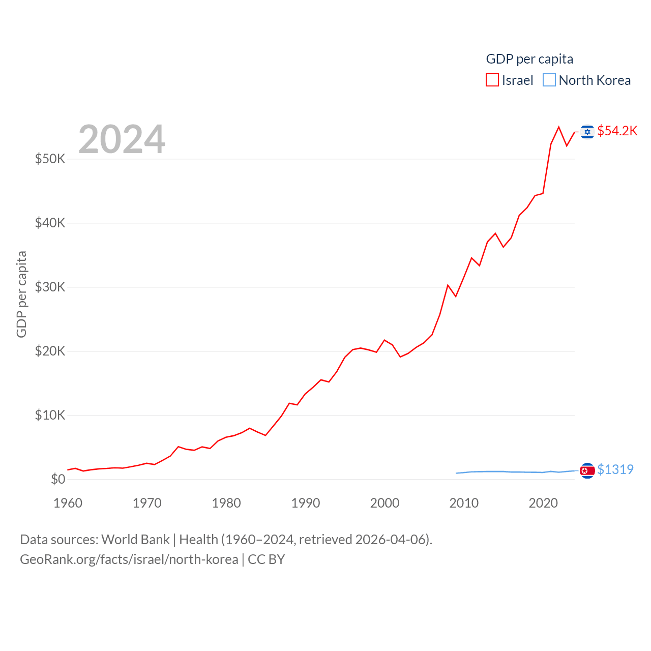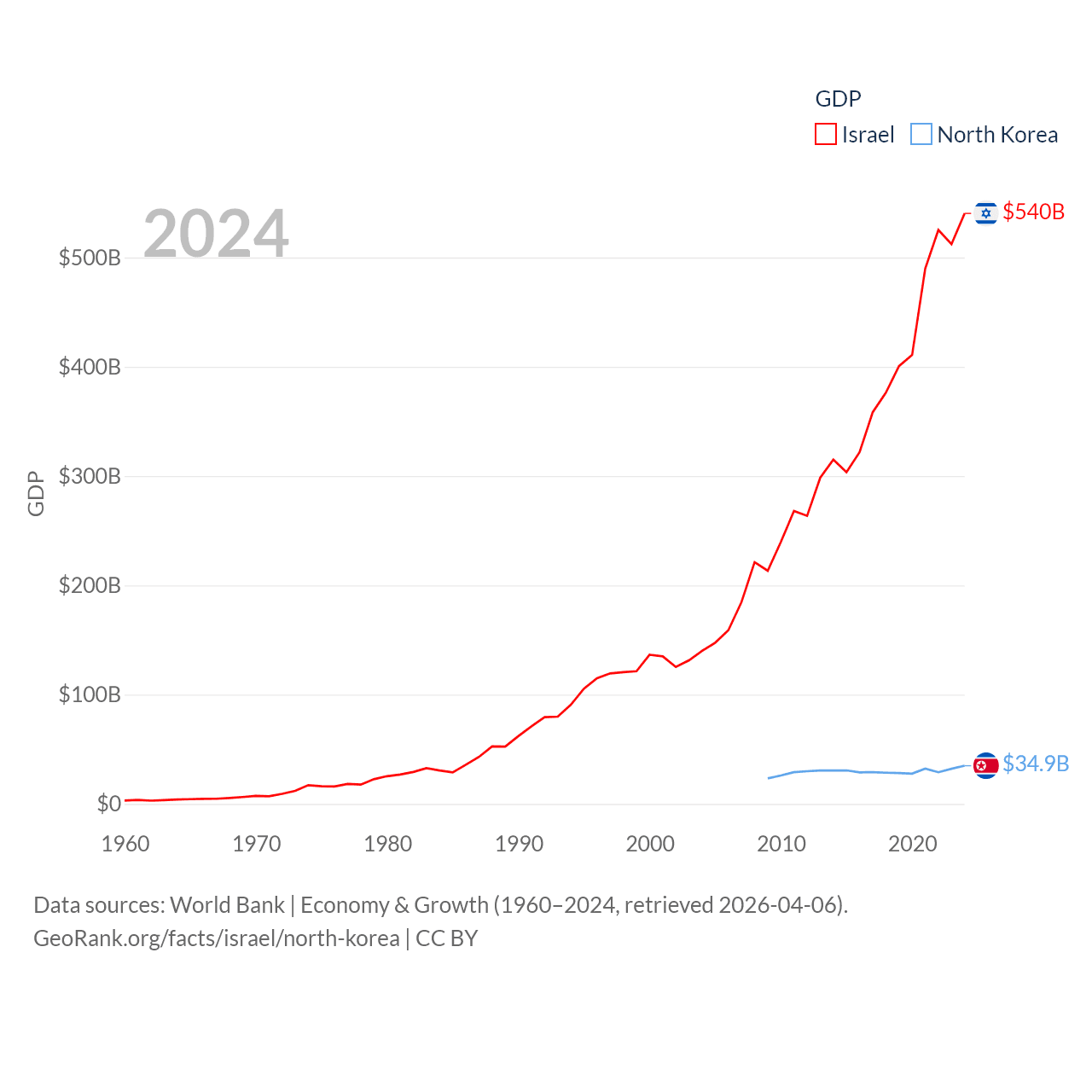 By GDP, Israel ranks 29/197 ($540B) and North Korea ranks 106/197 ($34.9B). By GDP per capita, Israel ranks 21/197 ($54,177), while North Korea ranks 168/197 ($1,319).