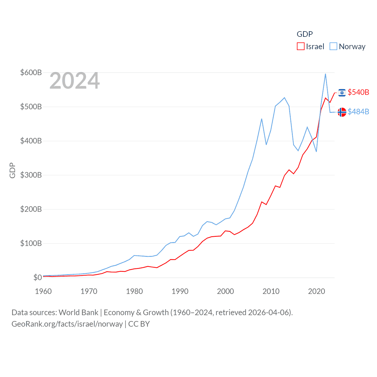 By GDP, Israel ranks 29/197 ($540B) and Norway ranks 32/197 ($484B). By GDP per capita, Israel ranks 21/197 ($54,177), while Norway ranks 8/197 ($86,785).
