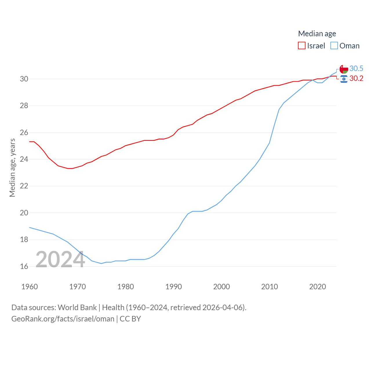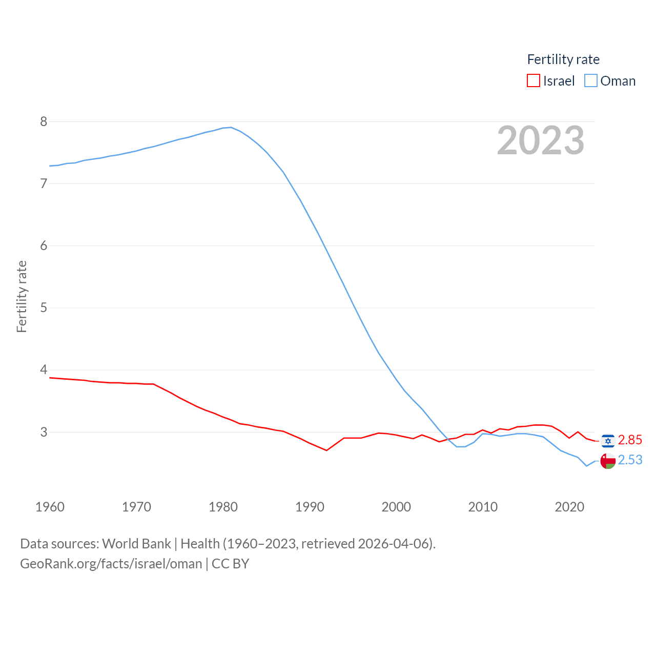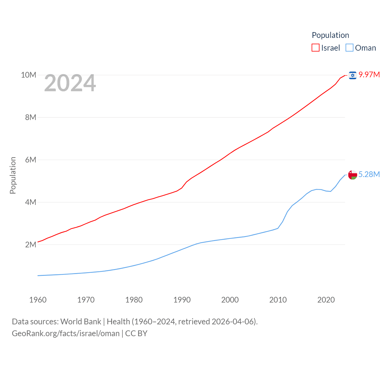 Israel has a population of 9.97M (ranked 96/197), compared with 5.28M in Oman (ranked 124/197). Israel's land area is 8,355 sq mi versus 119,499 sq mi for Oman (ranked 149th vs. 68th).