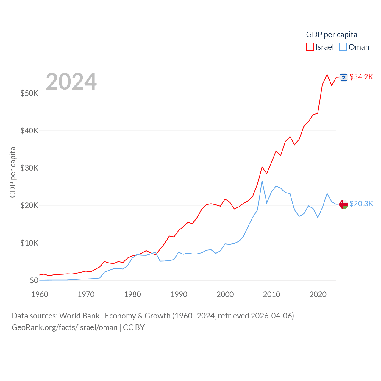By GDP, Israel ranks 29/197 ($540B) and Oman ranks 70/197 ($107B). By GDP per capita, Israel ranks 21/197 ($54,177), while Oman ranks 57/197 ($20,285).