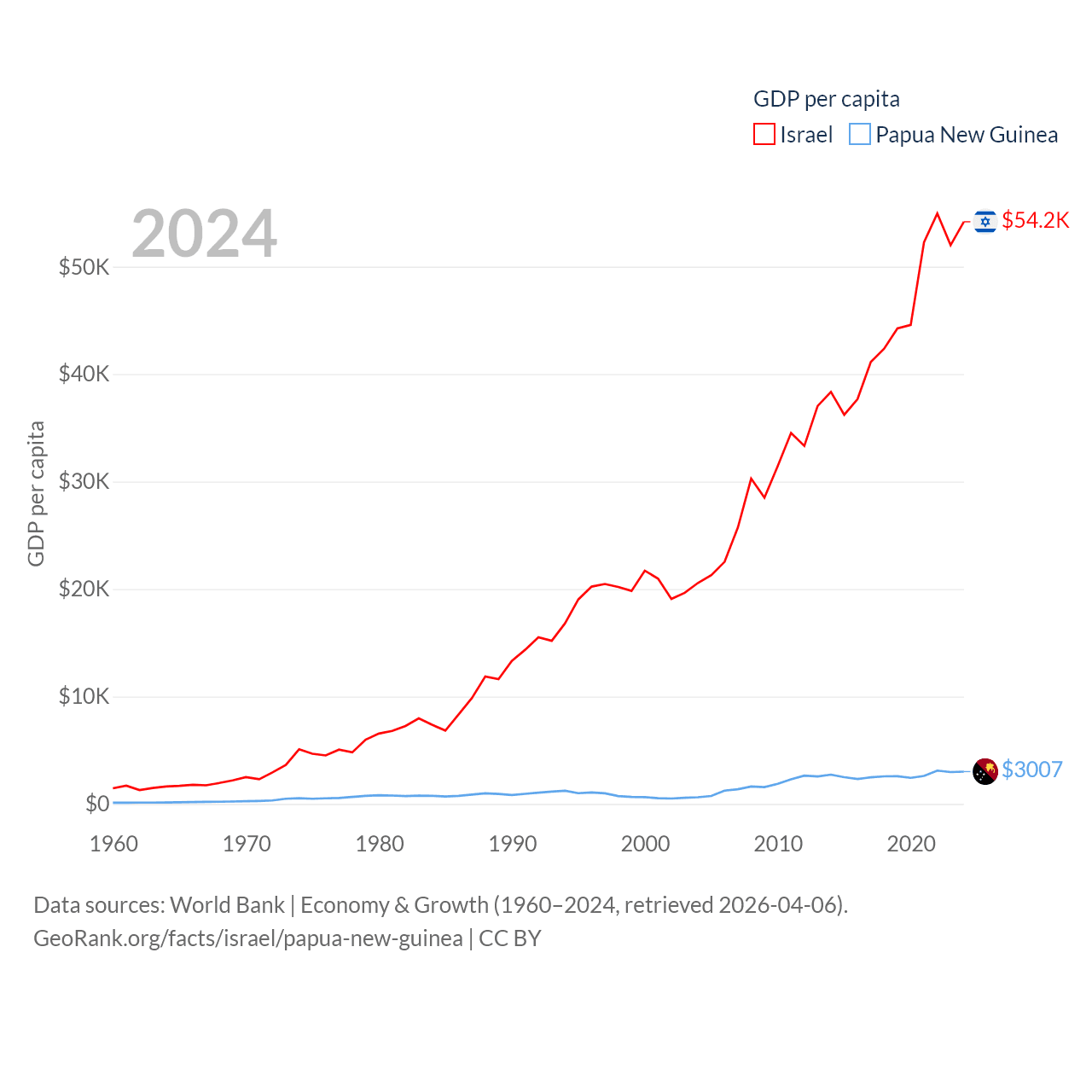 By GDP, Israel ranks 29/197 ($540B) and Papua New Guinea ranks 110/197 ($31.8B). By GDP per capita, Israel ranks 21/197 ($54,177), while Papua New Guinea ranks 140/197 ($3,007).