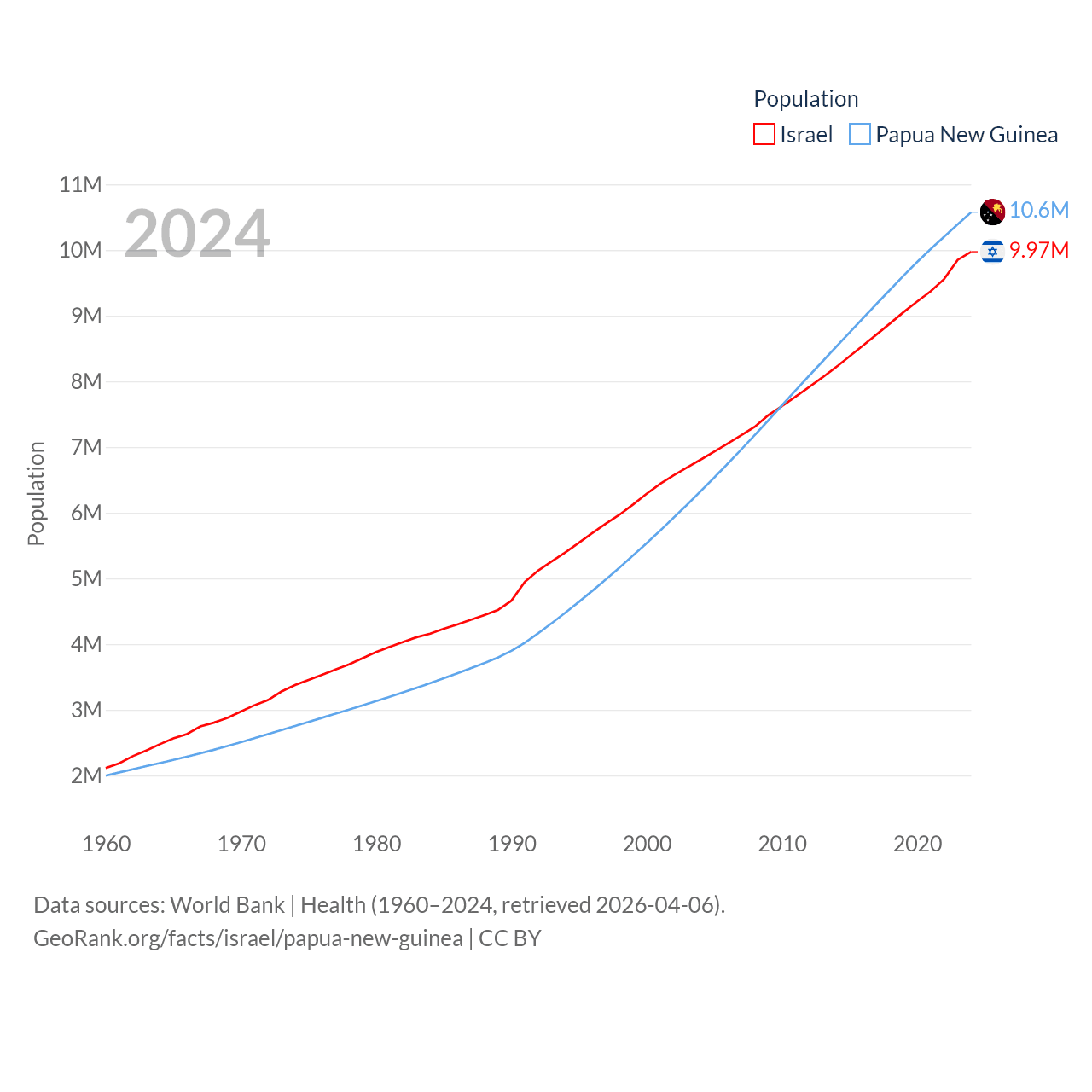 Israel has a population of 9.97M (ranked 96/197), compared with 10.6M in Papua New Guinea (ranked 92/197). Israel's land area is 8,355 sq mi versus 174,850 sq mi for Papua New Guinea (ranked 149th vs. 54th).