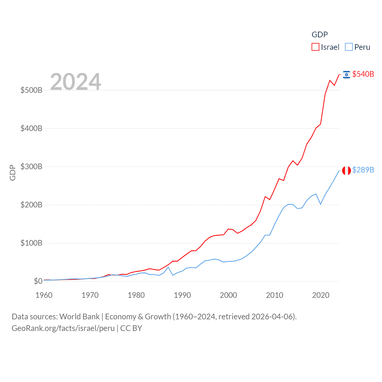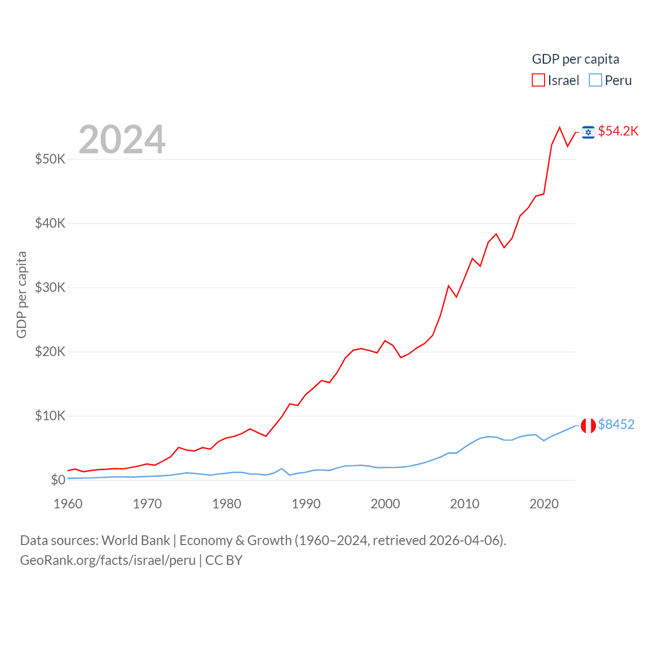 By GDP, Israel ranks 29/197 ($540B) and Peru ranks 49/197 ($289B). By GDP per capita, Israel ranks 21/197 ($54,177), while Peru ranks 91/197 ($8,452).