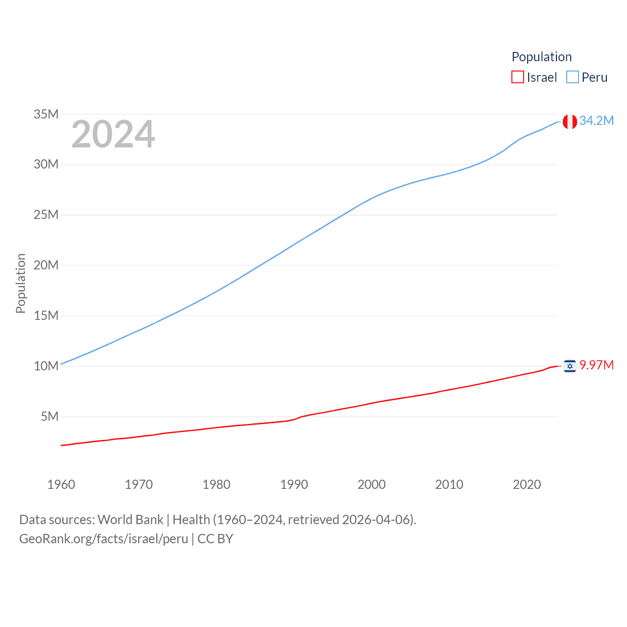 Israel has a population of 9.97M (ranked 96/197), compared with 34.2M in Peru (ranked 48/197). Israel's land area is 8,355 sq mi versus 494,211 sq mi for Peru (ranked 149th vs. 19th).