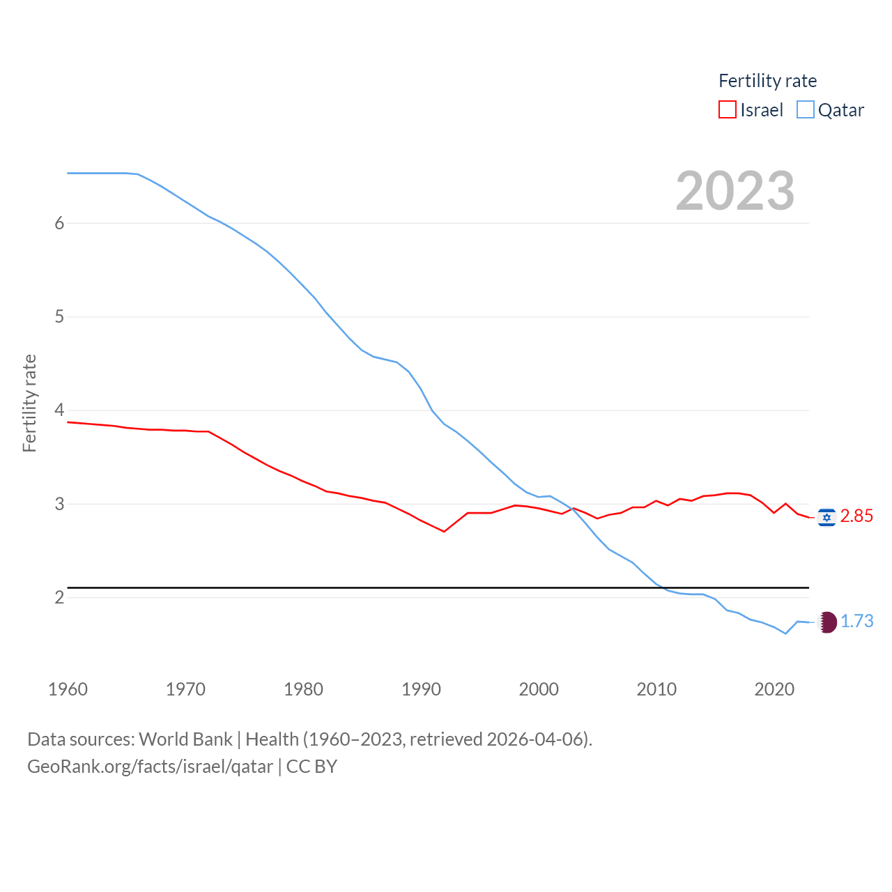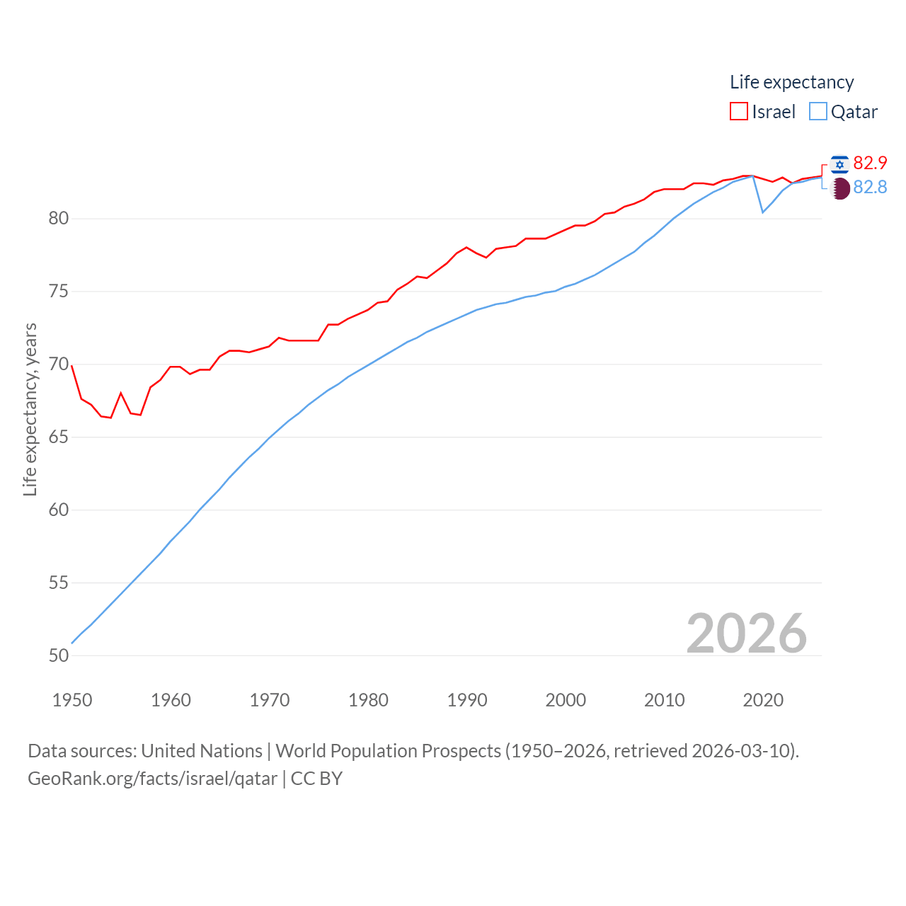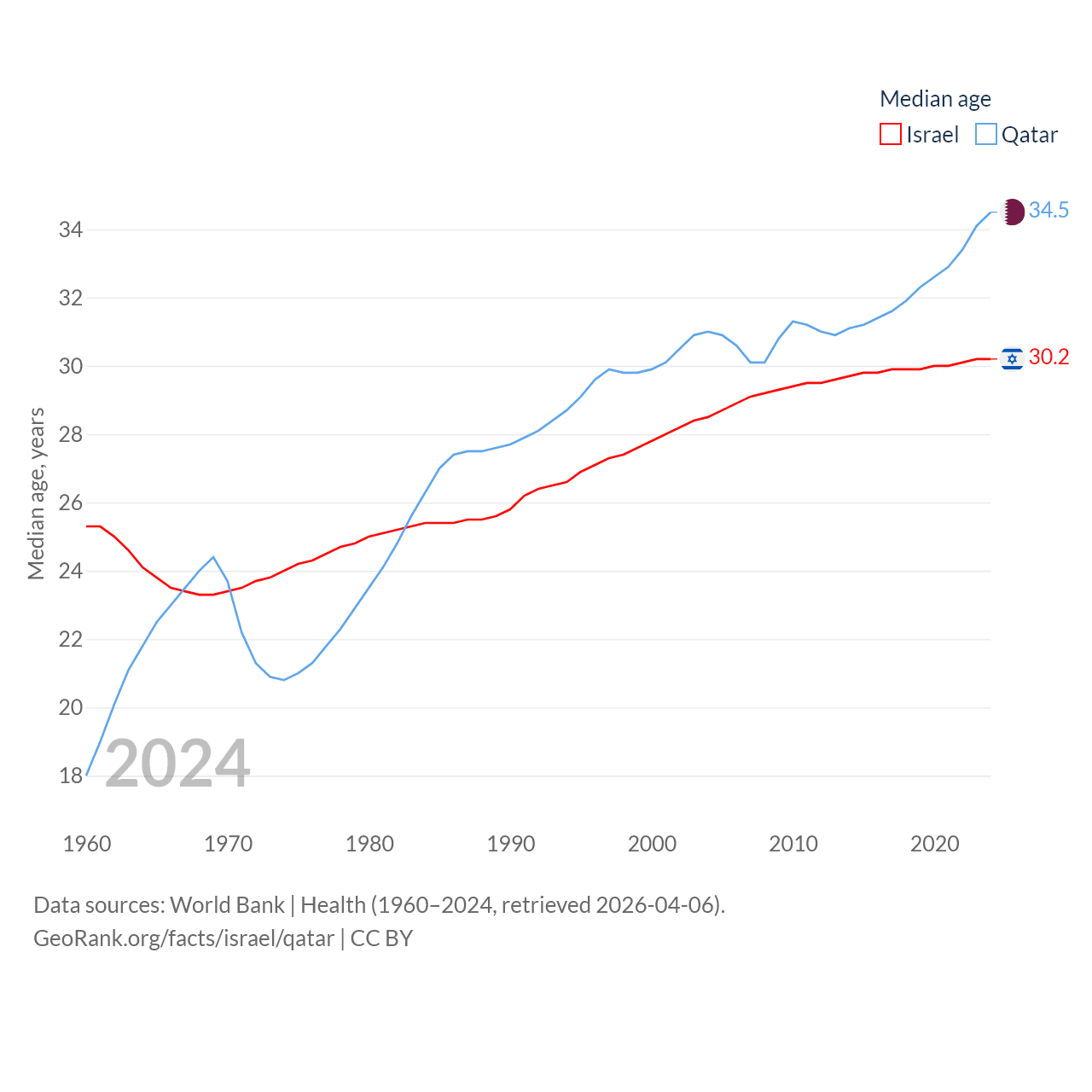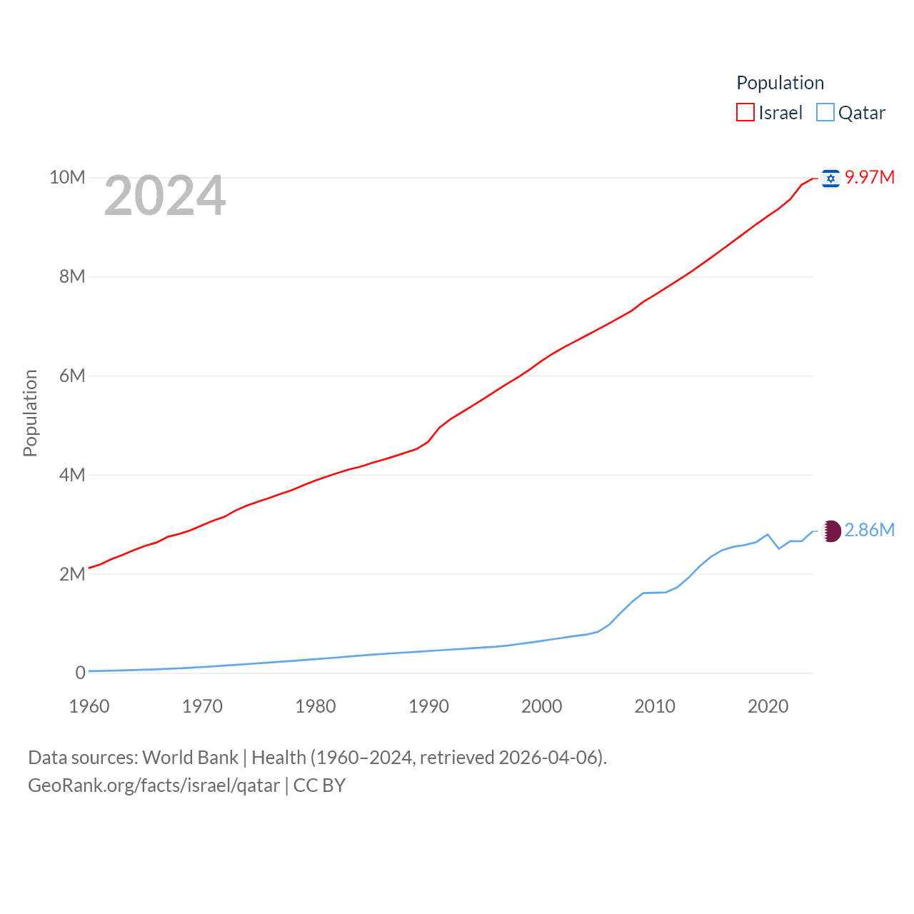 Israel has a population of 9.97M (ranked 96/197), compared with 2.86M in Qatar (ranked 138/197). Israel's land area is 8,355 sq mi versus 4,436 sq mi for Qatar (ranked 149th vs. 158th).