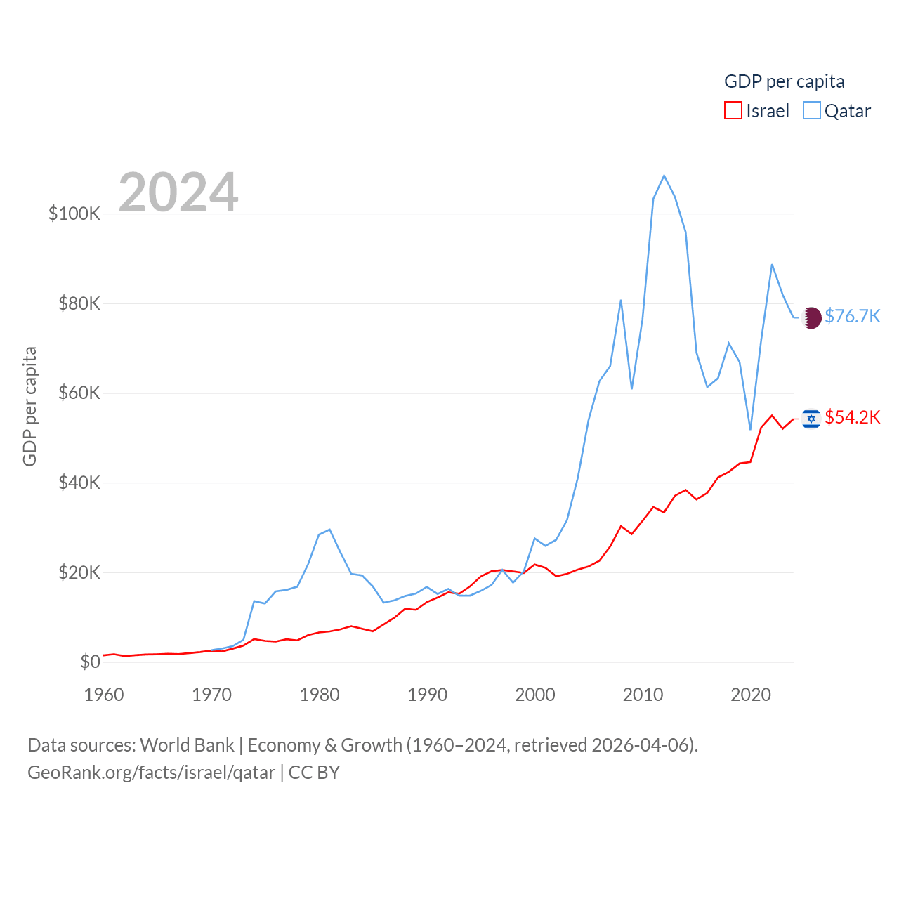 By GDP, Israel ranks 29/197 ($540B) and Qatar ranks 56/197 ($219B). By GDP per capita, Israel ranks 21/197 ($54,177), while Qatar ranks 11/197 ($76,689).