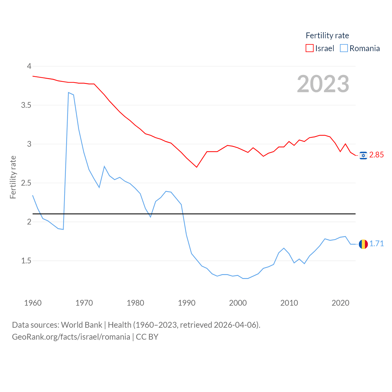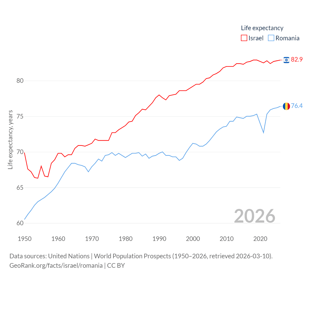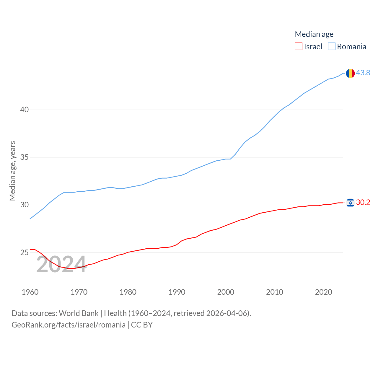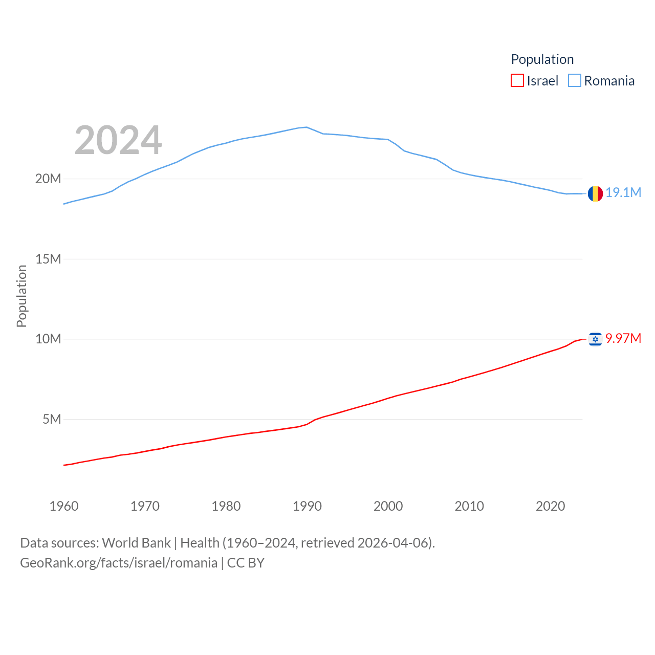 Israel has a population of 9.97M (ranked 96/197), compared with 19.1M in Romania (ranked 67/197). Israel's land area is 8,355 sq mi versus 88,834 sq mi for Romania (ranked 149th vs. 80th).