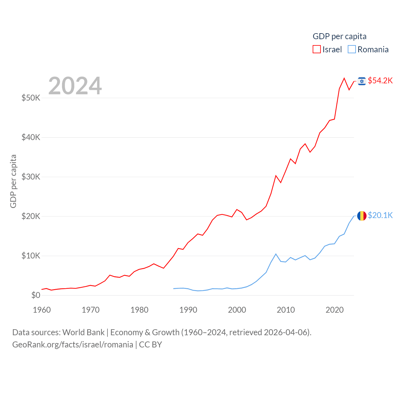 By GDP, Israel ranks 29/197 ($540B) and Romania ranks 42/197 ($383B). By GDP per capita, Israel ranks 21/197 ($54,177), while Romania ranks 58/197 ($20,080).