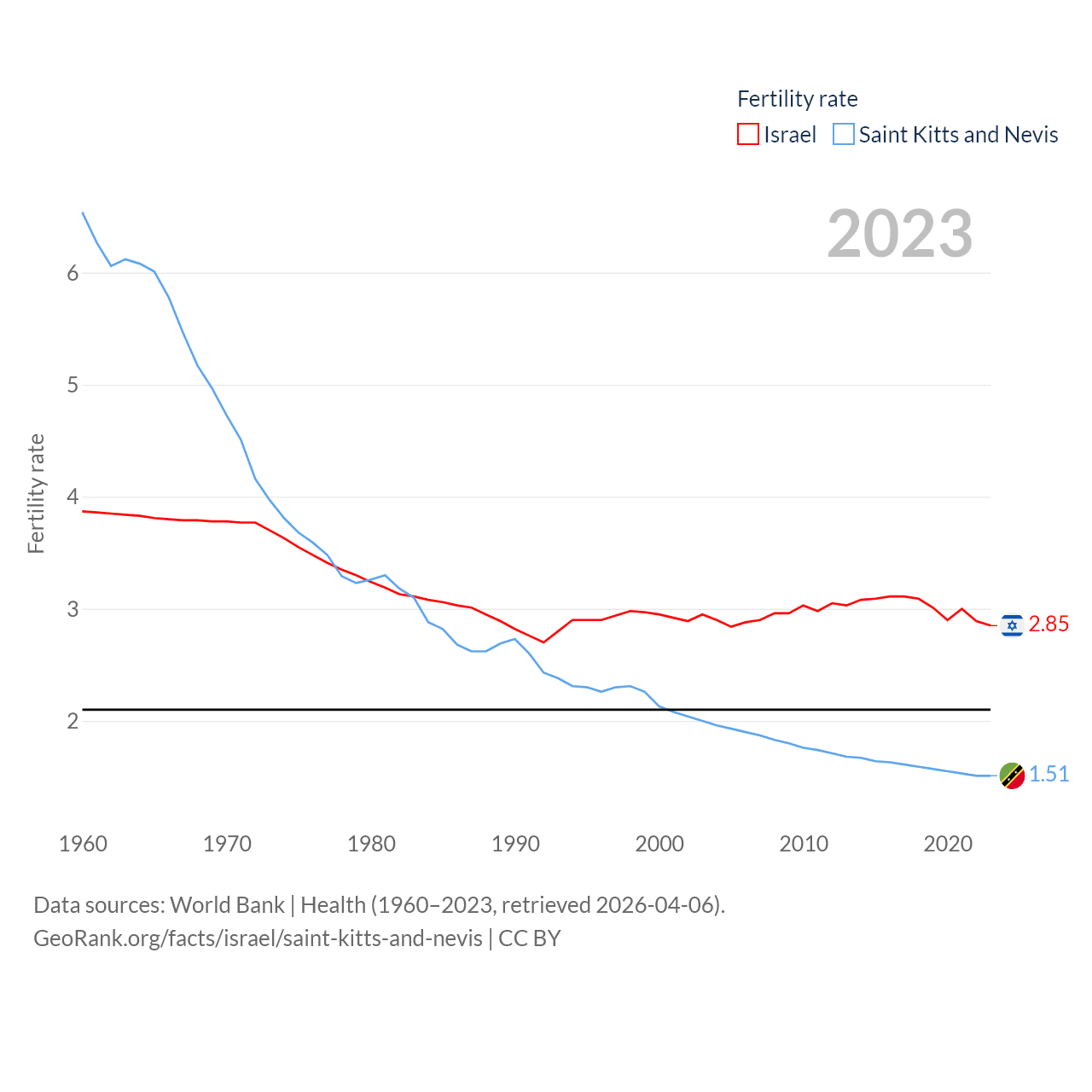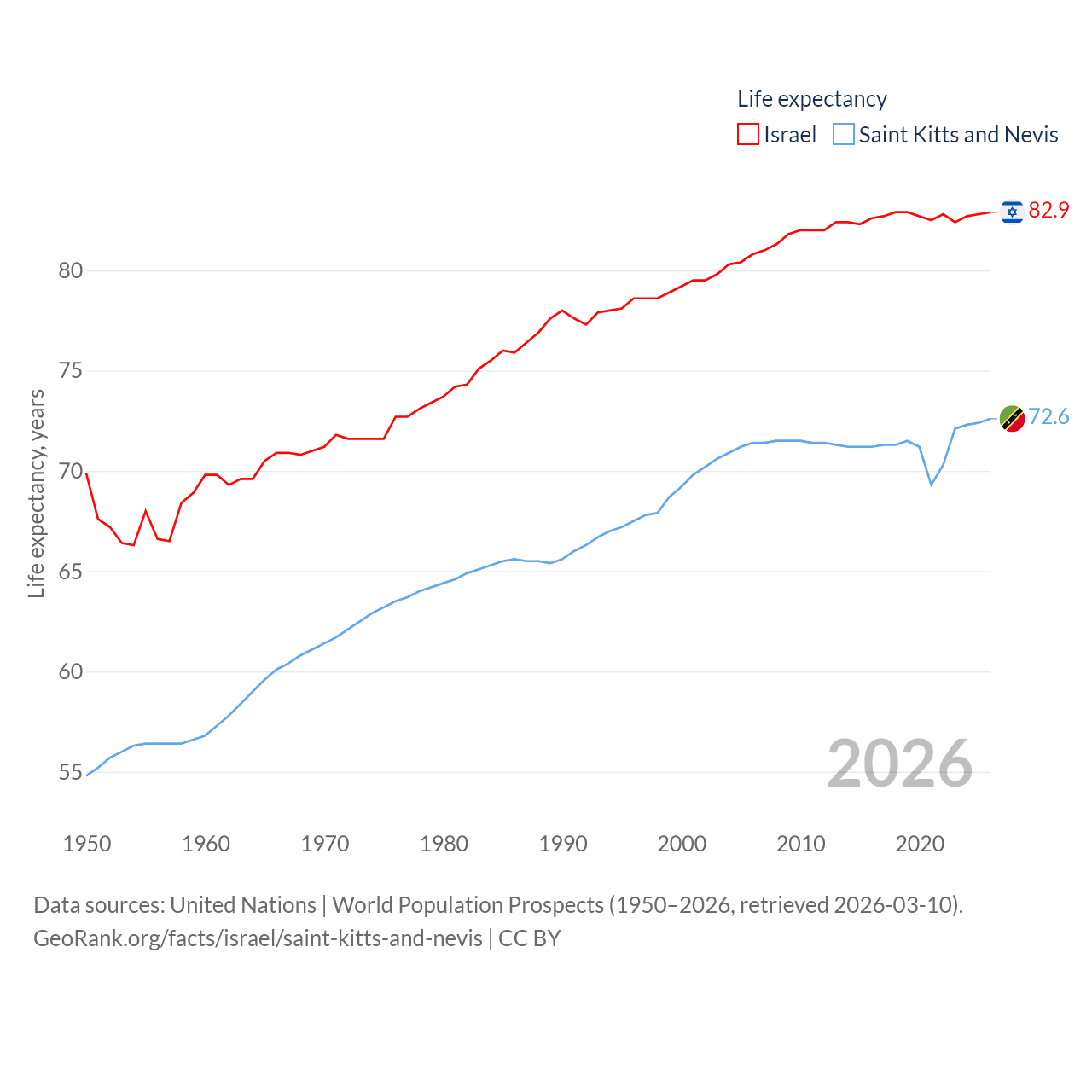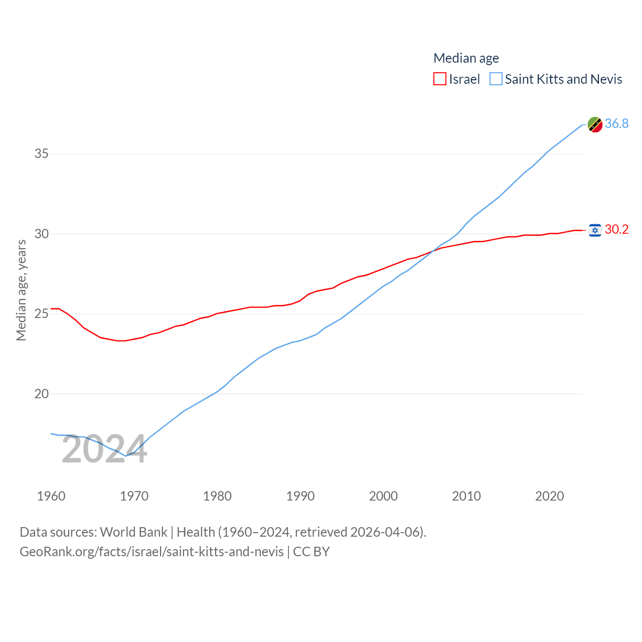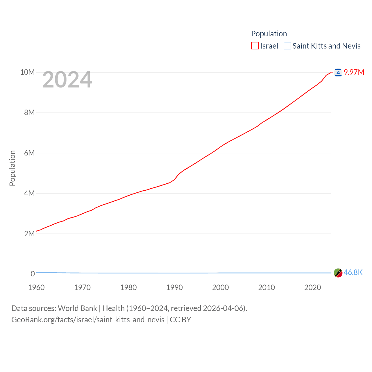 Israel has a population of 9.97M (ranked 96/197), compared with 46.8K in Saint Kitts and Nevis (ranked 189/197). Israel's land area is 8,355 sq mi versus 100.4 sq mi for Saint Kitts and Nevis (ranked 149th vs. 189th).