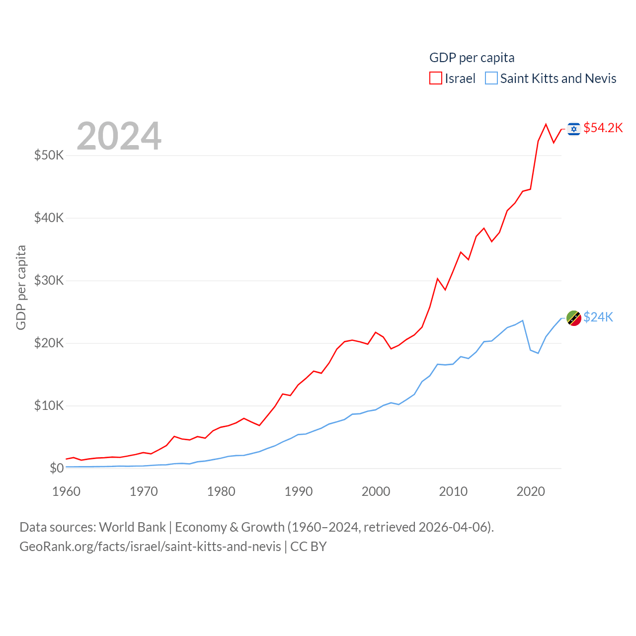 By GDP, Israel ranks 29/197 ($540B) and Saint Kitts and Nevis ranks 187/197 ($1.12B). By GDP per capita, Israel ranks 21/197 ($54,177), while Saint Kitts and Nevis ranks 51/197 ($23,961).