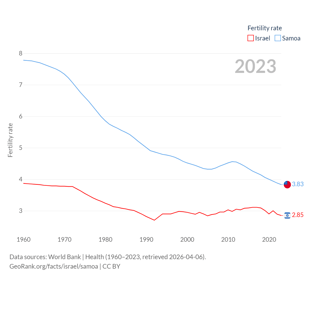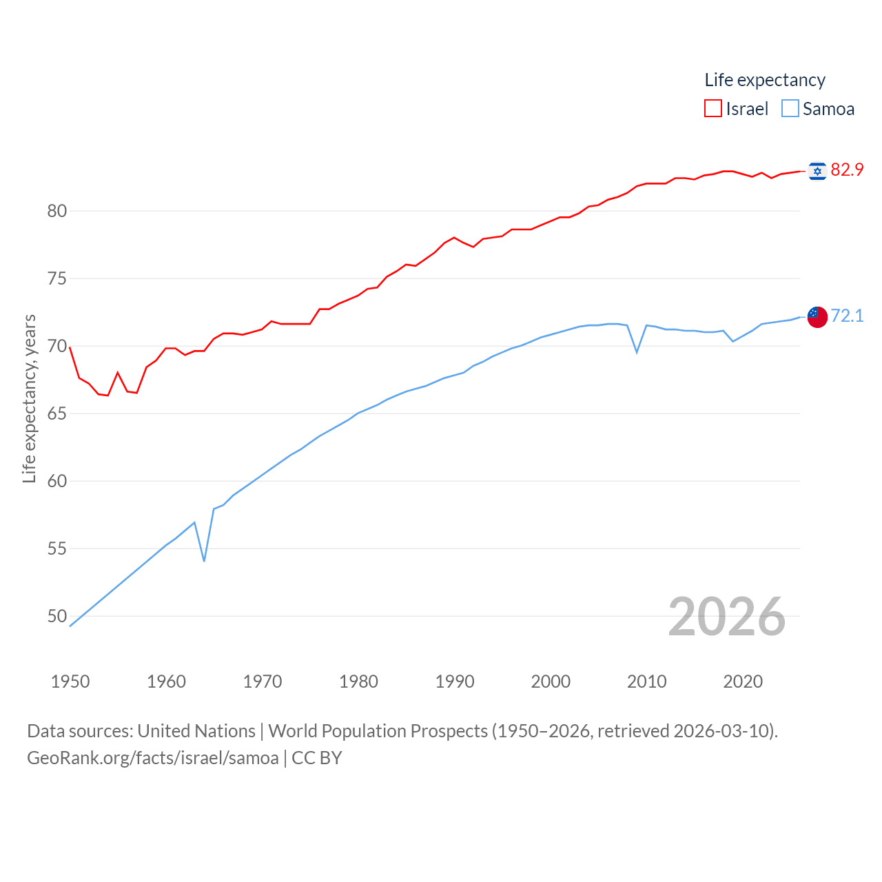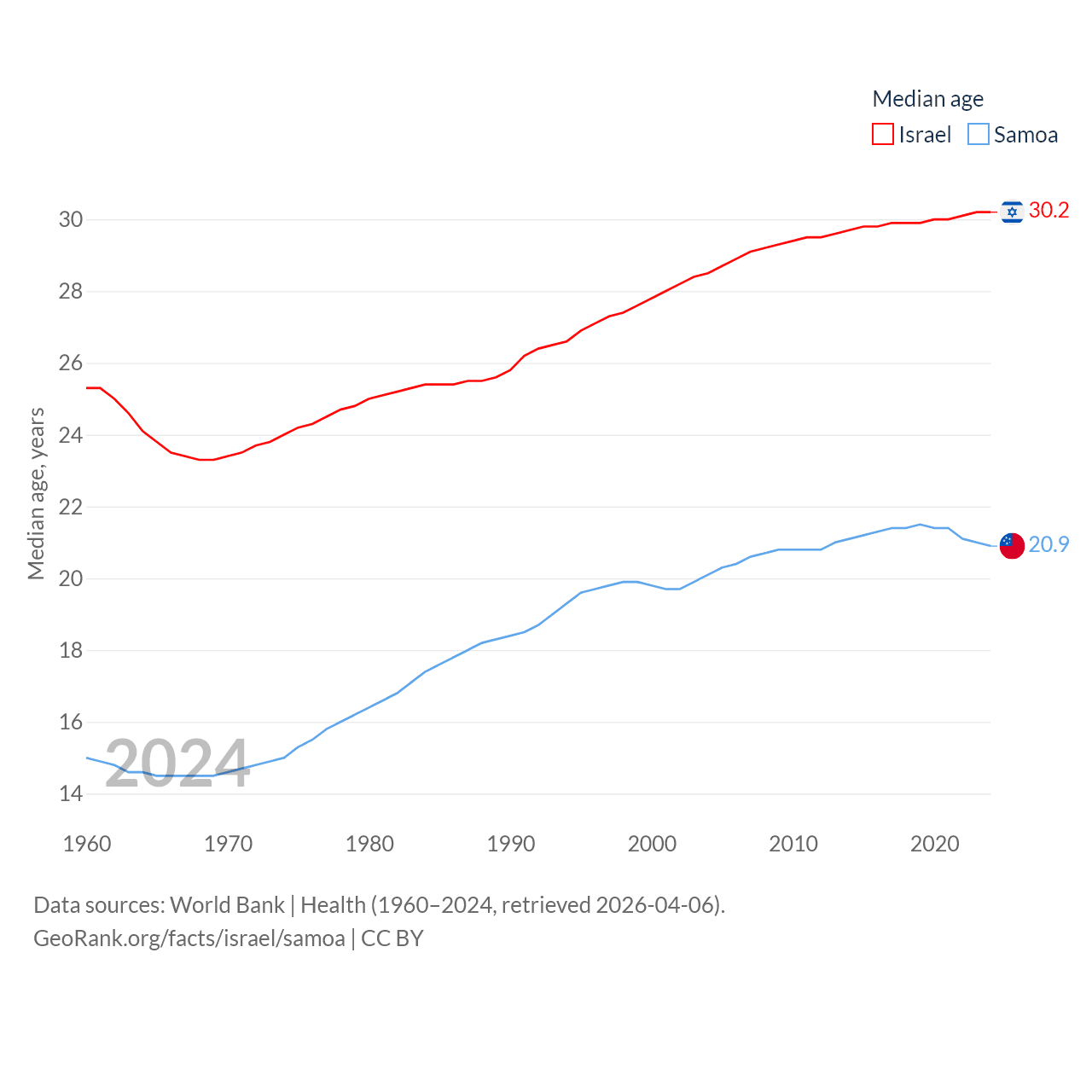 Israel has a population of 9.97M (ranked 96/197), compared with 218K in Samoa (ranked 177/197). Israel's land area is 8,355 sq mi versus 1,073 sq mi for Samoa (ranked 149th vs. 168th).