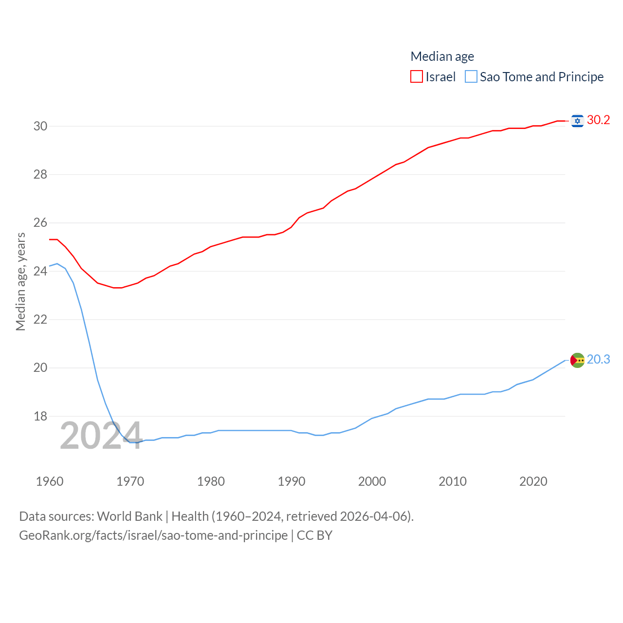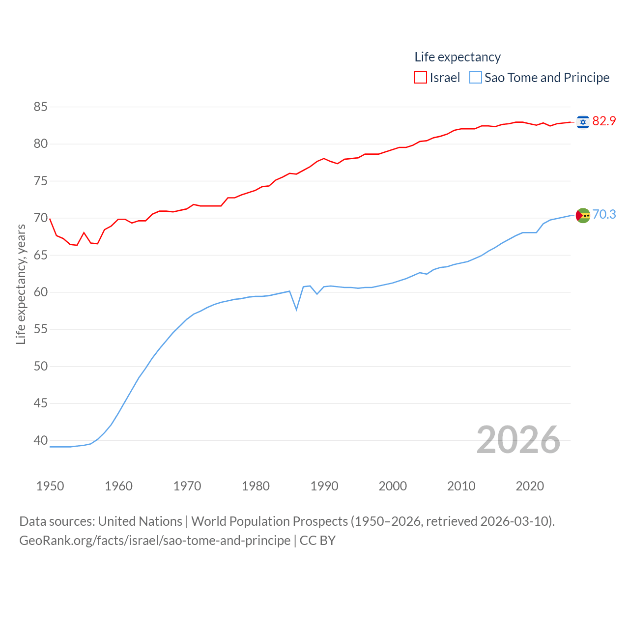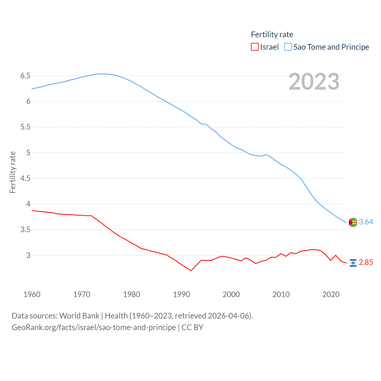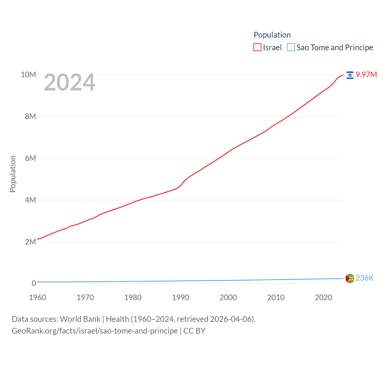 Israel has a population of 9.97M (ranked 96/197), compared with 236K in Sao Tome and Principe (ranked 176/197). Israel's land area is 8,355 sq mi versus 371 sq mi for Sao Tome and Principe (ranked 149th vs. 172nd).
