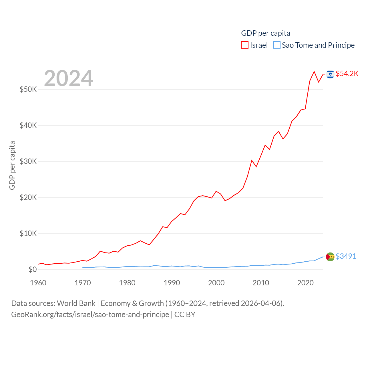 By GDP, Israel ranks 29/197 ($540B) and Sao Tome and Principe ranks 189/197 ($822M). By GDP per capita, Israel ranks 21/197 ($54,177), while Sao Tome and Principe ranks 134/197 ($3,491).
