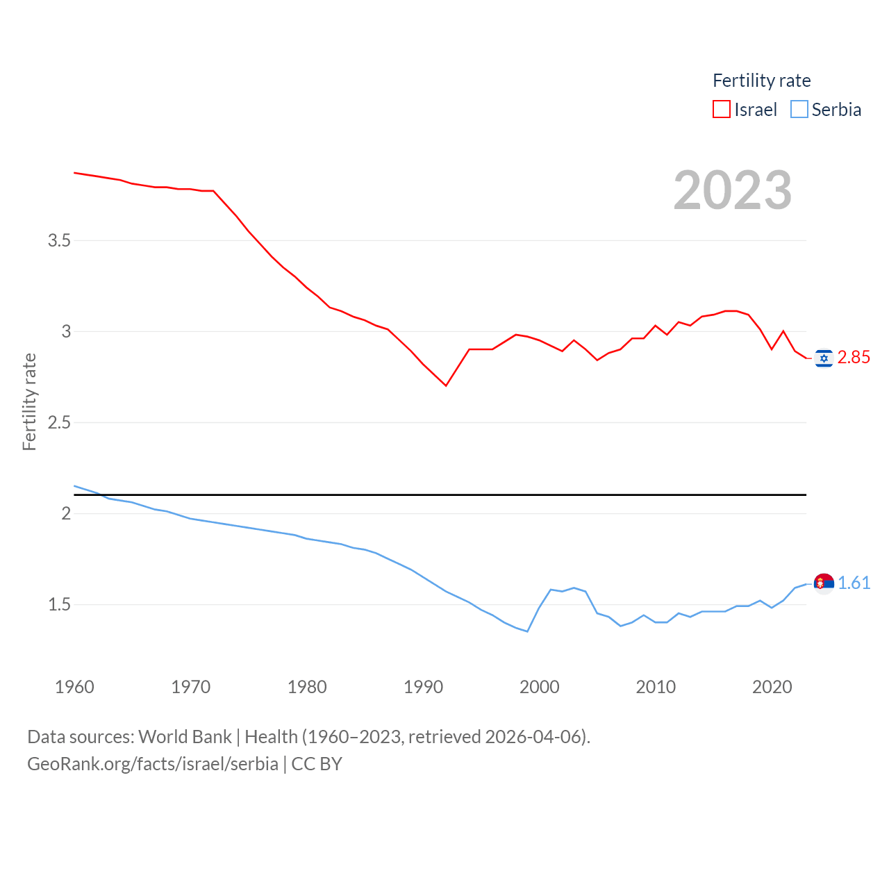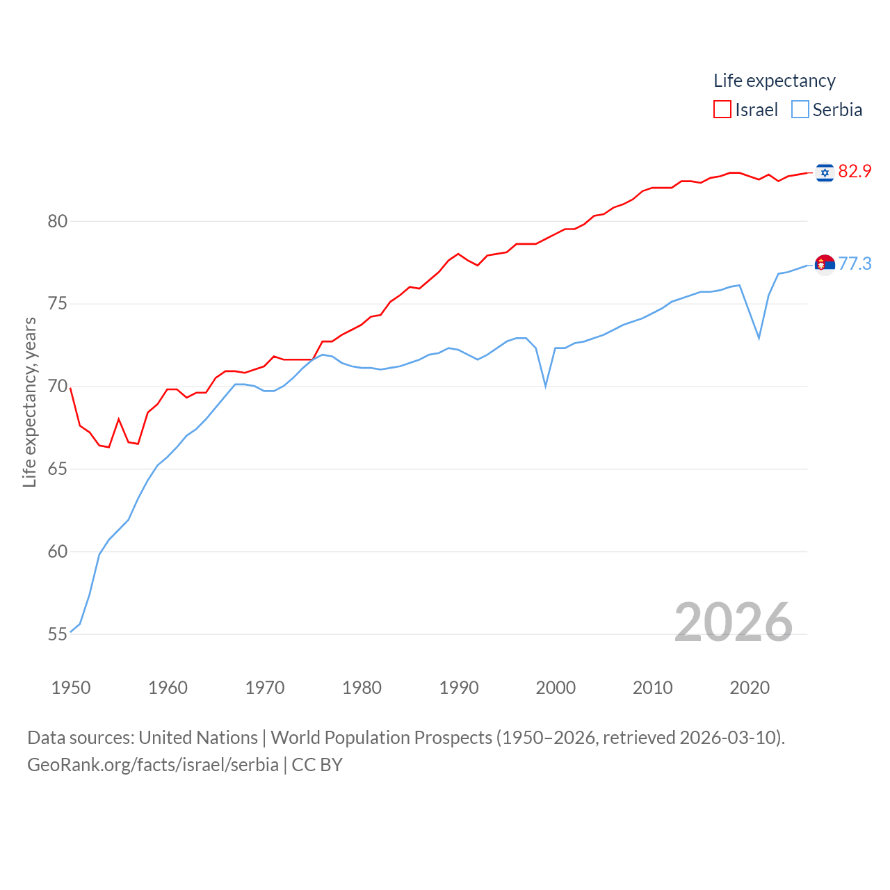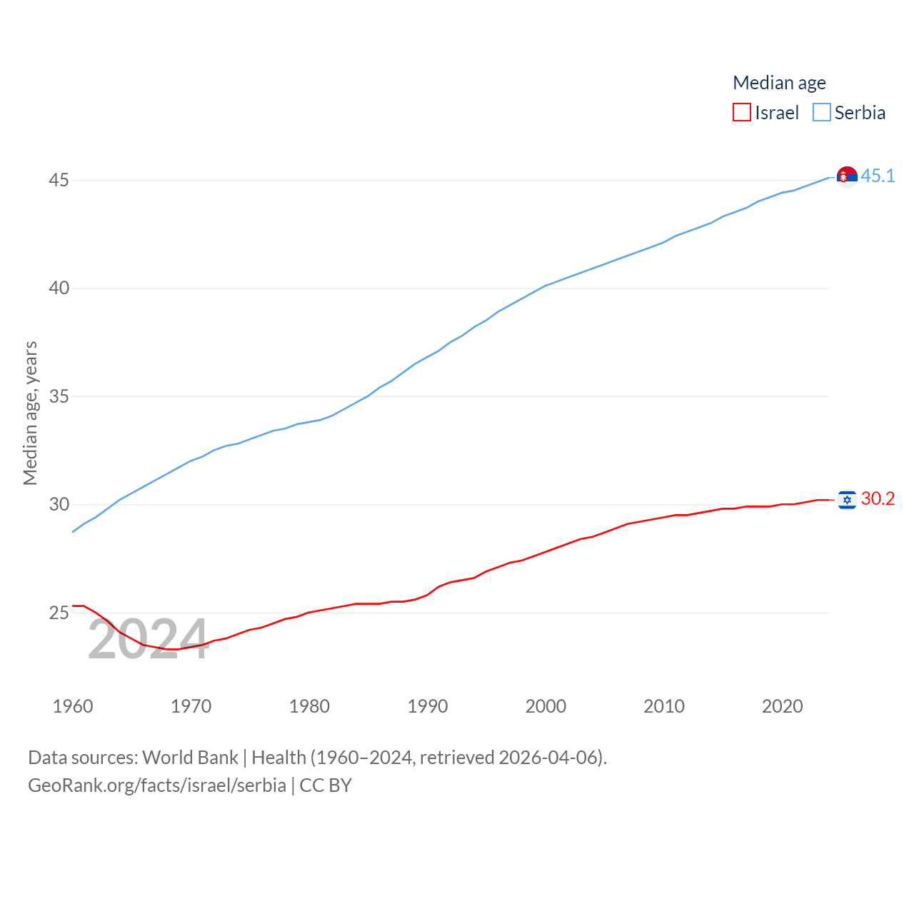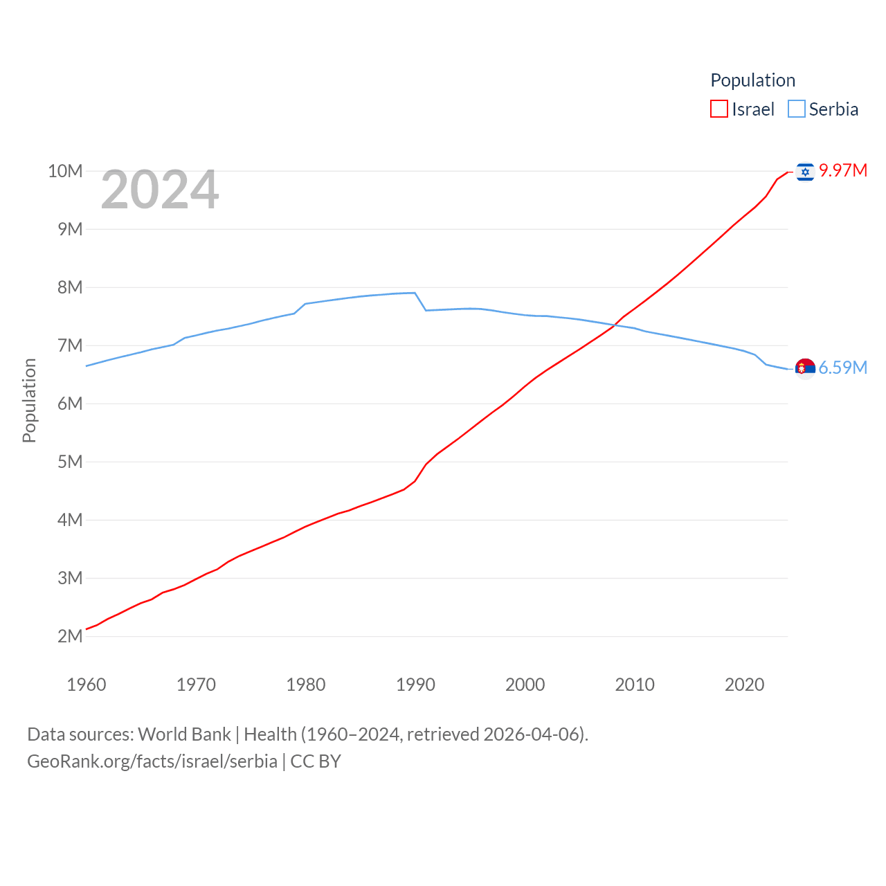 Israel has a population of 9.97M (ranked 96/197), compared with 6.59M in Serbia (ranked 109/197). Israel's land area is 8,355 sq mi versus 32,467 sq mi for Serbia (ranked 149th vs. 111th).