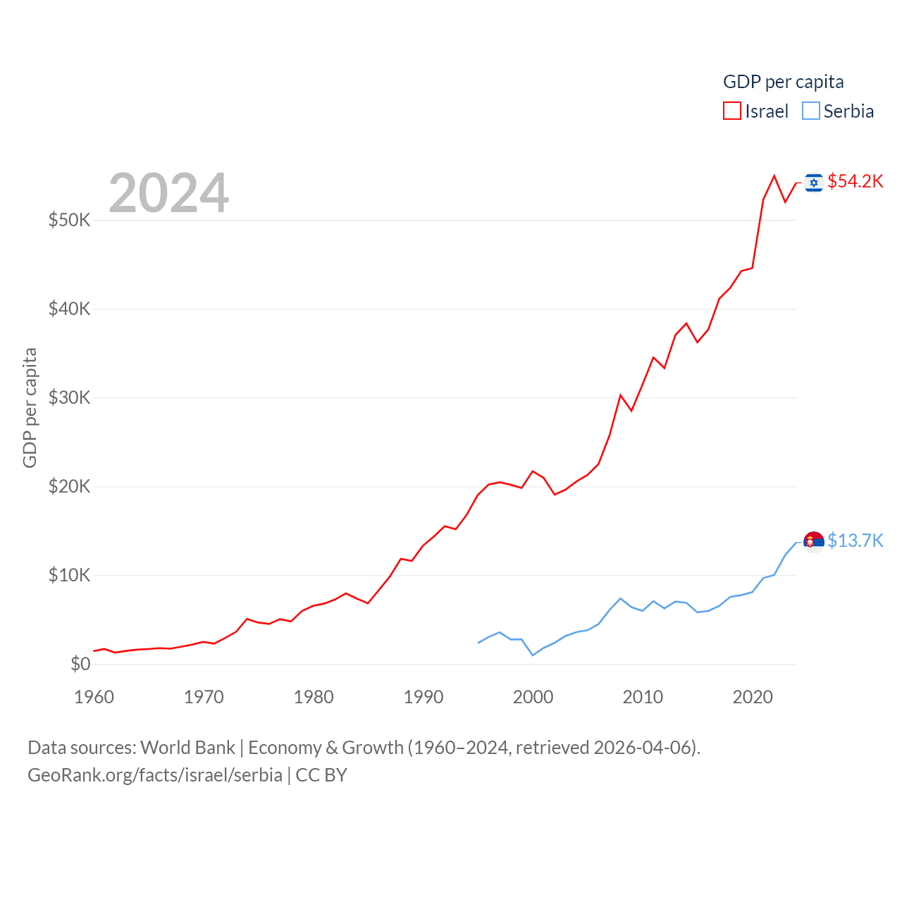 By GDP, Israel ranks 29/197 ($540B) and Serbia ranks 76/197 ($90.1B). By GDP per capita, Israel ranks 21/197 ($54,177), while Serbia ranks 73/197 ($13,679).