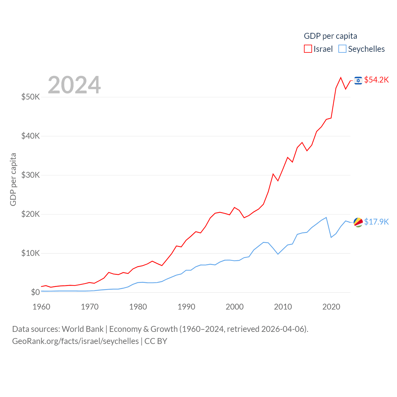 By GDP, Israel ranks 29/197 ($540B) and The Seychelles ranks 178/197 ($2.17B). By GDP per capita, Israel ranks 21/197 ($54,177), while The Seychelles ranks 63/197 ($17,859).