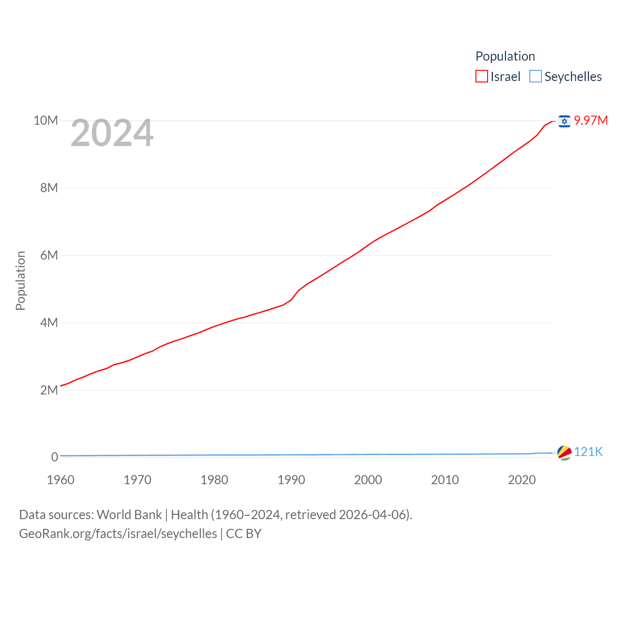 Israel has a population of 9.97M (ranked 96/197), compared with 121K in The Seychelles (ranked 181/197). Israel's land area is 8,355 sq mi versus 177.6 sq mi for The Seychelles (ranked 149th vs. 181st).