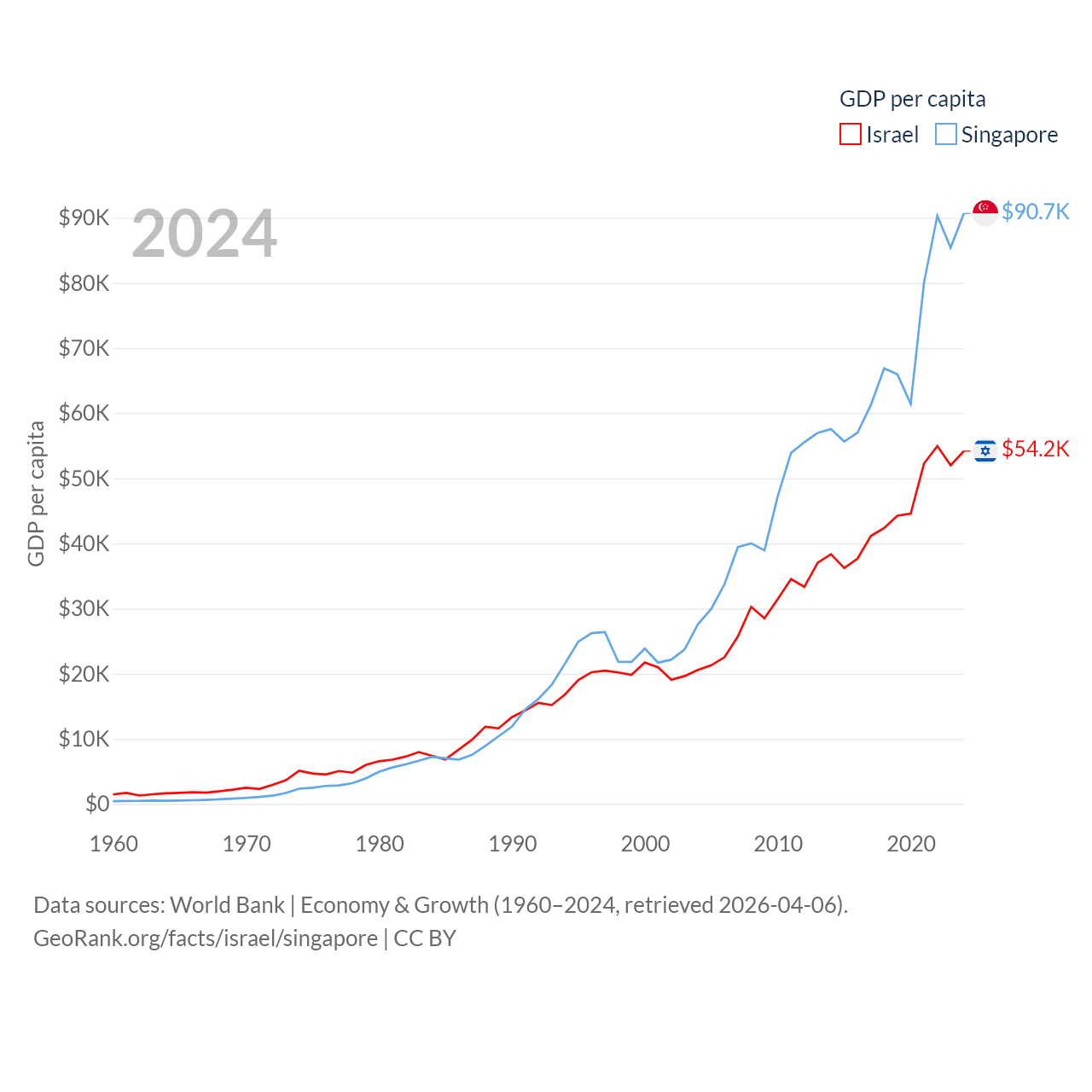By GDP, Israel ranks 29/197 ($540B) and Singapore ranks 28/197 ($547B). By GDP per capita, Israel ranks 21/197 ($54,177), while Singapore ranks 7/197 ($90,674).