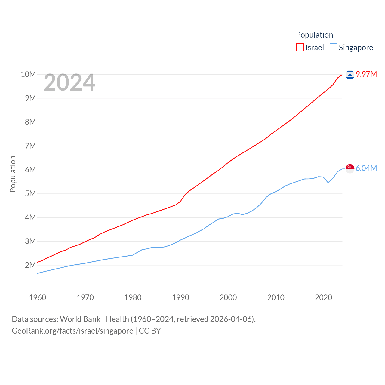 Israel has a population of 9.97M (ranked 96/197), compared with 6.04M in Singapore (ranked 113/197). Israel's land area is 8,355 sq mi versus 277.2 sq mi for Singapore (ranked 149th vs. 177th).
