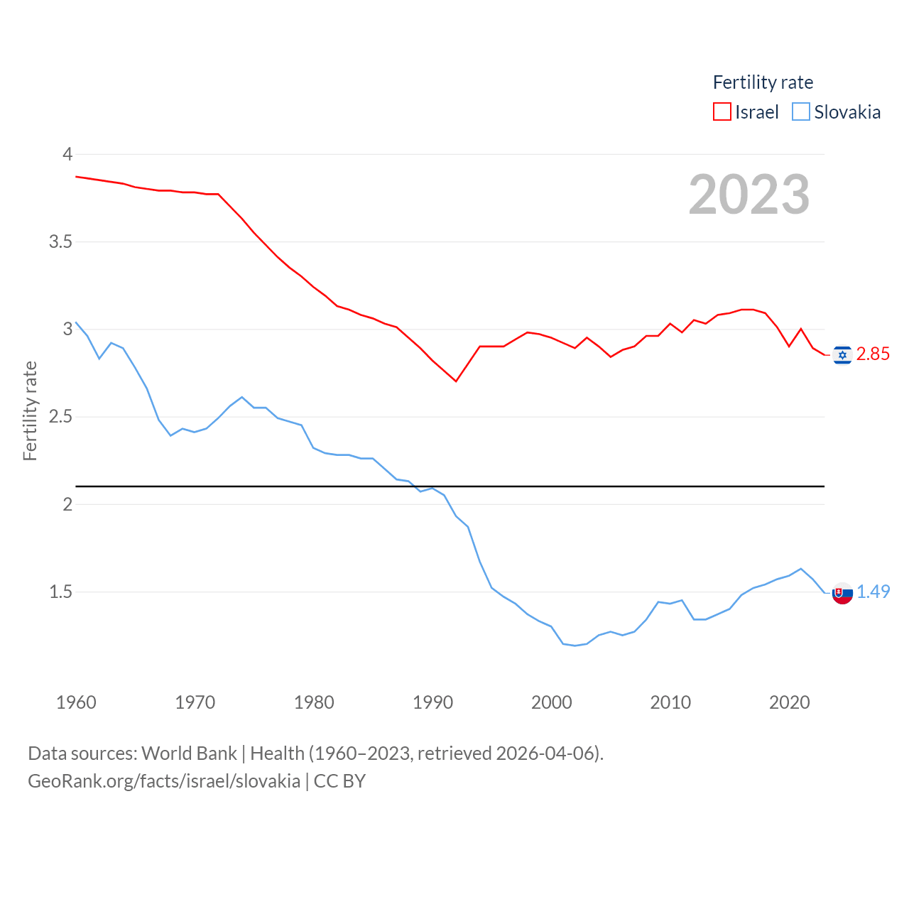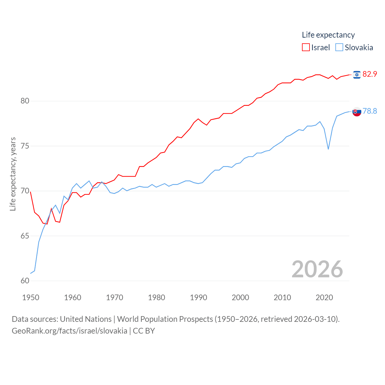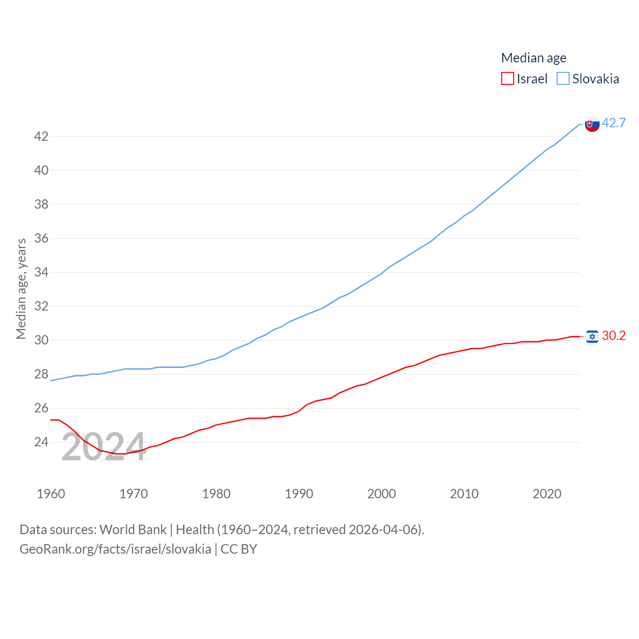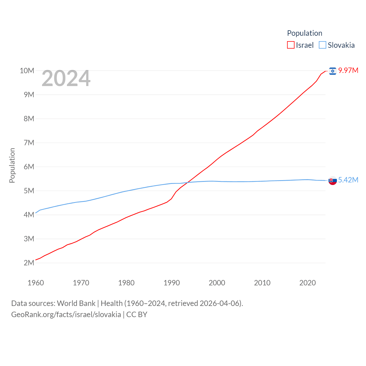 Israel has a population of 9.97M (ranked 96/197), compared with 5.42M in Slovakia (ranked 119/197). Israel's land area is 8,355 sq mi versus 18,564 sq mi for Slovakia (ranked 149th vs. 128th).