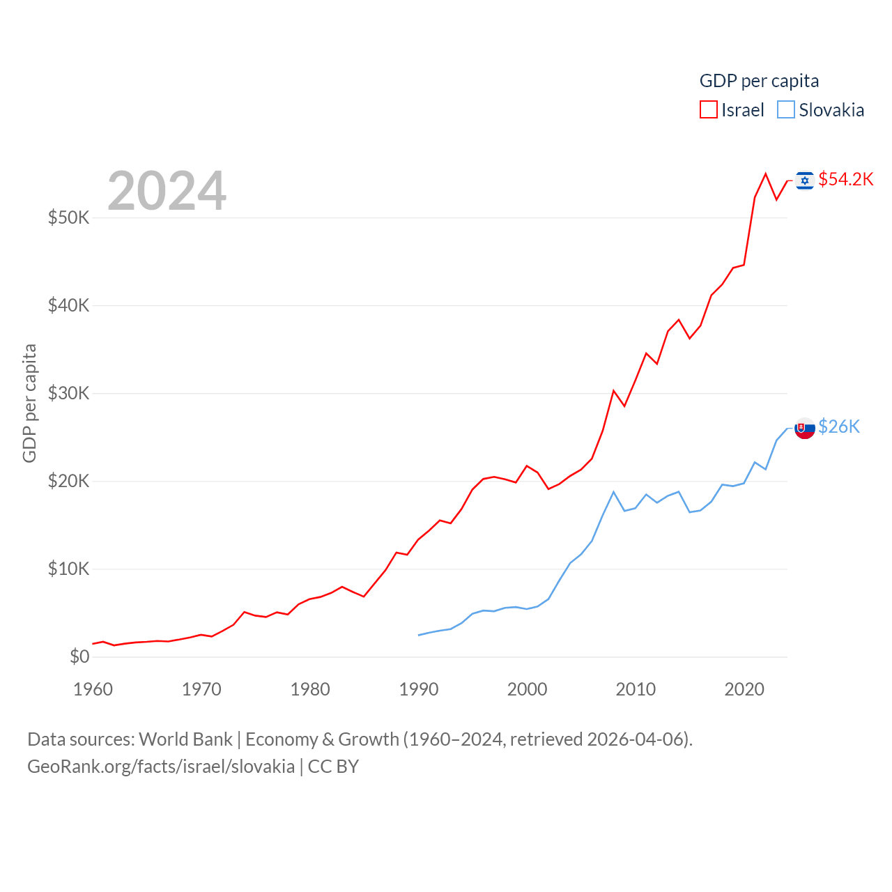 By GDP, Israel ranks 29/197 ($540B) and Slovakia ranks 61/197 ($141B). By GDP per capita, Israel ranks 21/197 ($54,177), while Slovakia ranks 47/197 ($25,993).