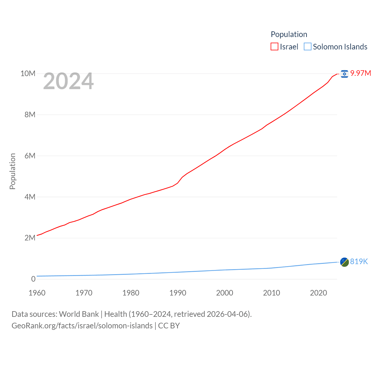 Israel has a population of 9.97M (ranked 96/197), compared with 819K in The Solomon Islands (ranked 162/197). Israel's land area is 8,355 sq mi versus 10,807 sq mi for The Solomon Islands (ranked 149th vs. 141st).